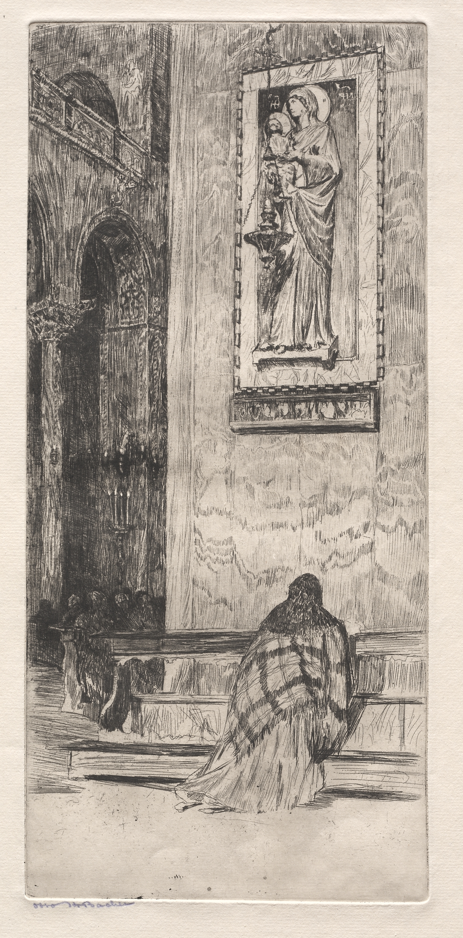 Black and white etching of a woman kneeling in prayer. The woman wears a long dress and a plaid shawl. She faces away from the viewer, toward the bottom center of the image. In the background, a stone wall features an inset relief sculpture of the Madonna and child. To the left, another archway is visible. The title of the work is "St. Marks" and it was created by Otto H. Bacher.