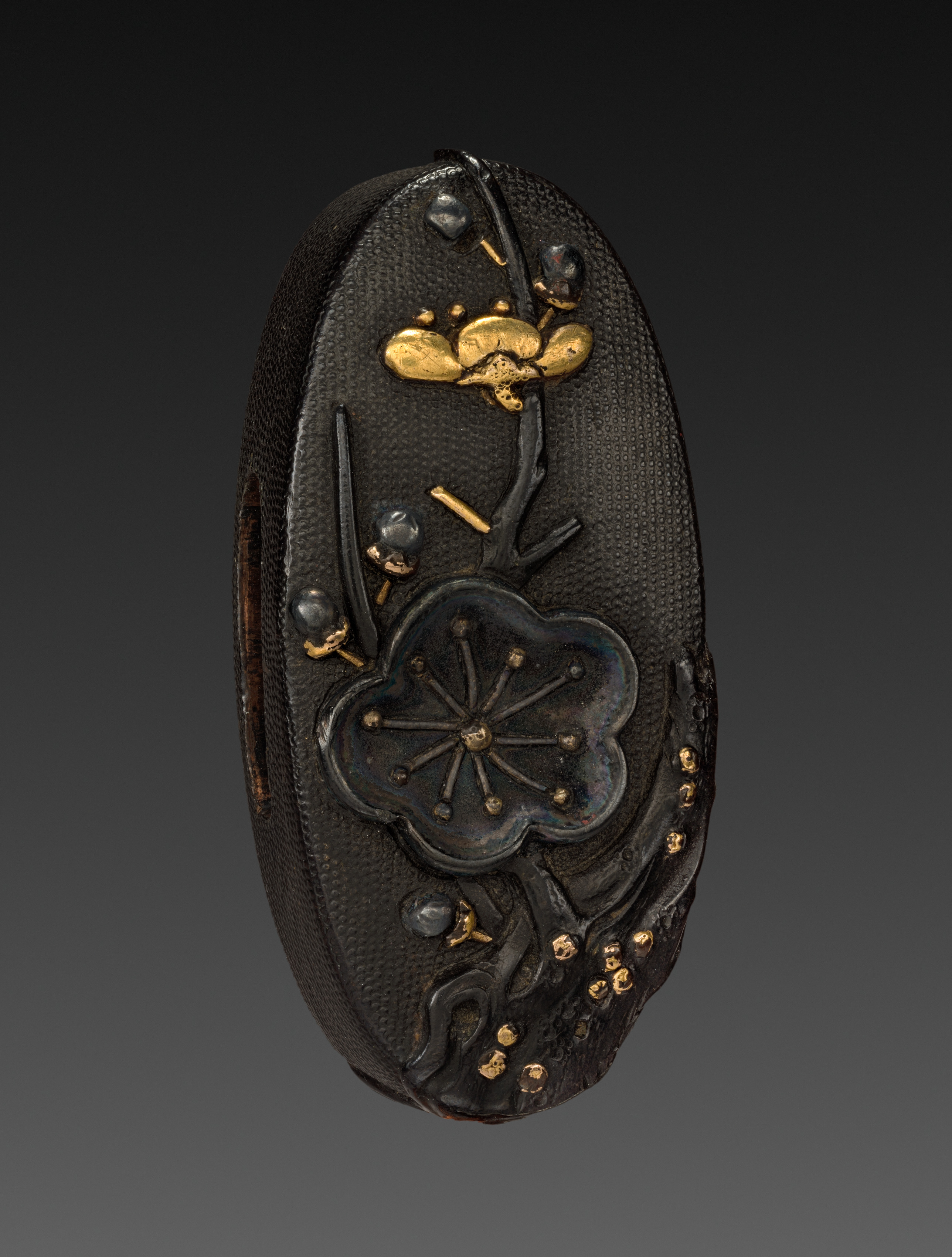 Oval-shaped, black sword hilt pommel with textured surface, featuring a raised black flower design with gold accents and a gold insect near the top.