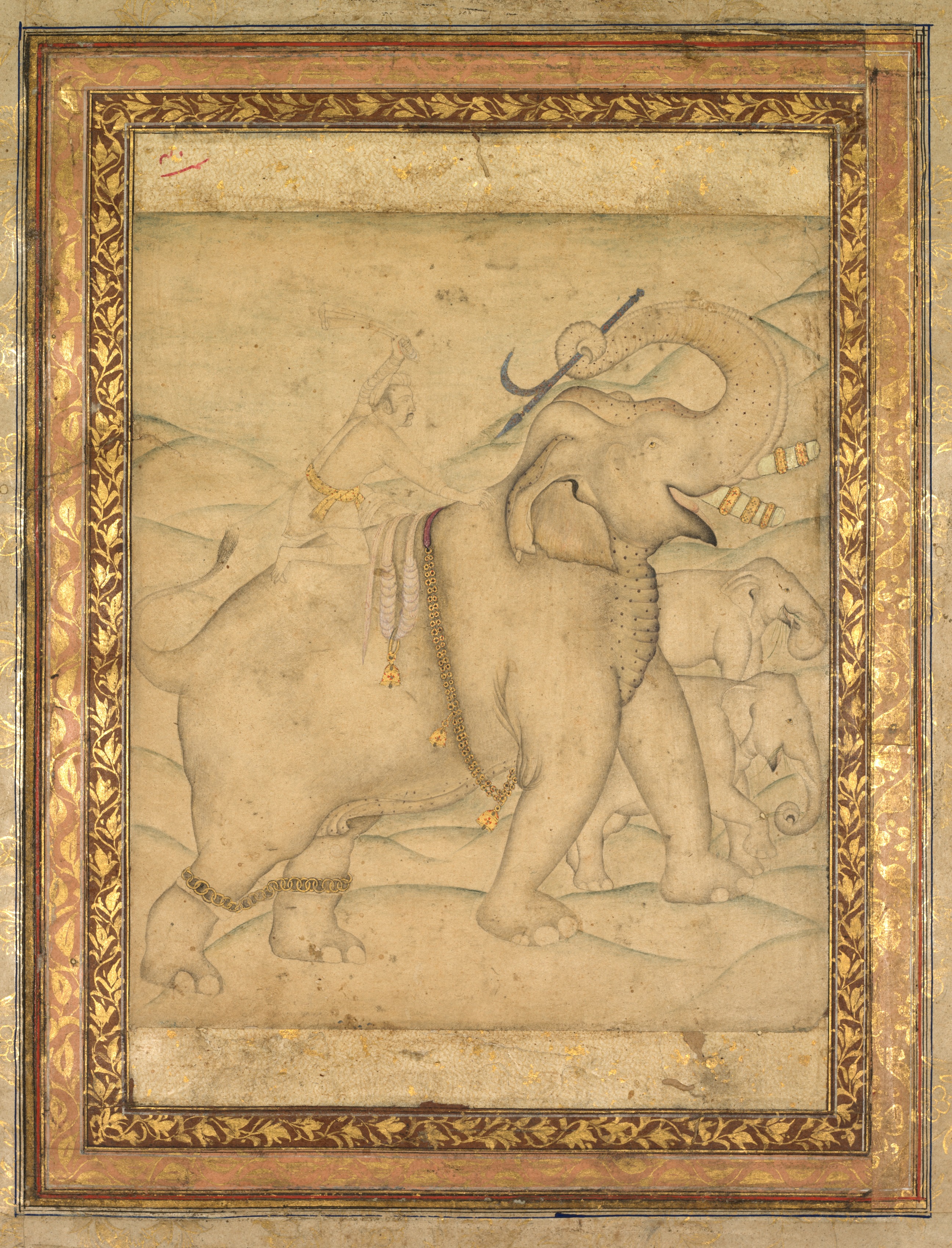 Portrait of Emperor Jahangir Riding an Elephant by artist Abid. Beige-colored artwork with gold leaf and pink frame with gold leaf; rectangular shape. Emperor Jahangir riding on a large beige elephant facing right; man on elephant wears a white robe; holds curved sword over shoulder; elephant wears gold jewelry on head, leg and tail; two elephants in background; one small; one large being ridden.