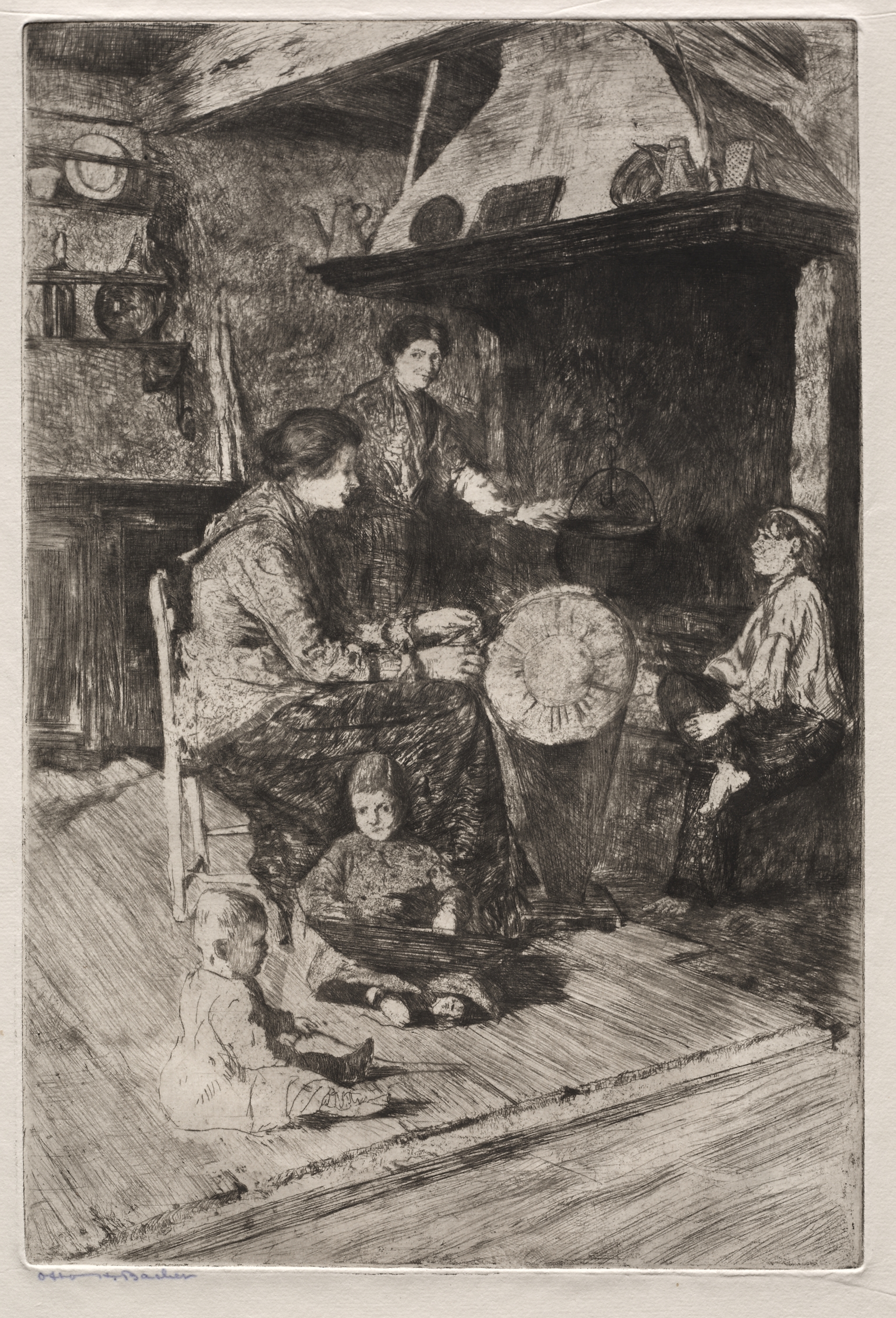 Black and white image of a family scene. A woman sits in a chair on the left. A small child sits on the floor to her right. A toddler sits on a cushion on the floor. A woman stands behind the seated woman. A young boy sits on a bench on the right. A large piece of round fabric or paper with designs on it leans against a table. The room is dimly lit. There are various objects on shelves in the background. A slanted roof and chimney are visible. The image depicts lace makers at work.