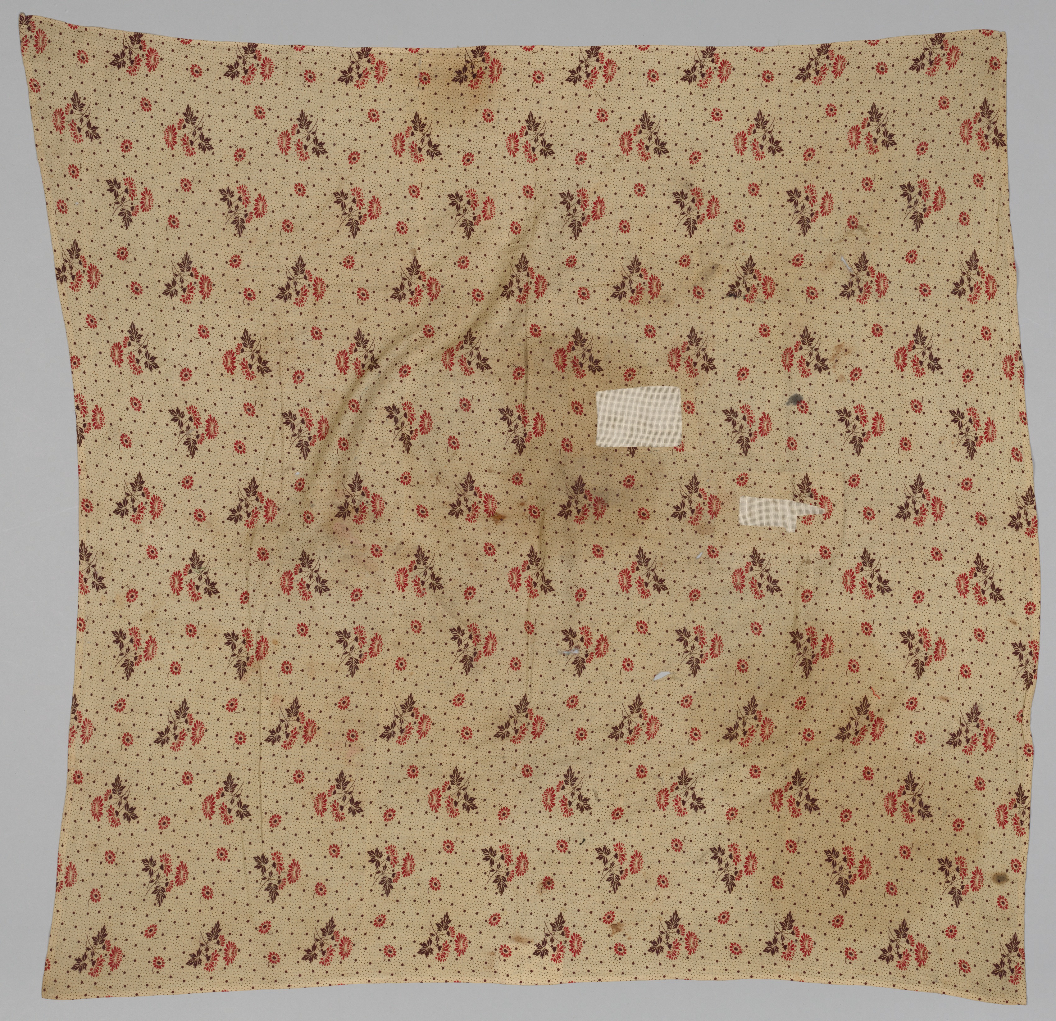 Tan cloth with small black dots and a repeating floral pattern featuring red flowers and brown leaves; two small rectangles of off-white fabric are on the right side. The cloth is titled "Wrapper (Furoshiki)" and is by an unknown artist.