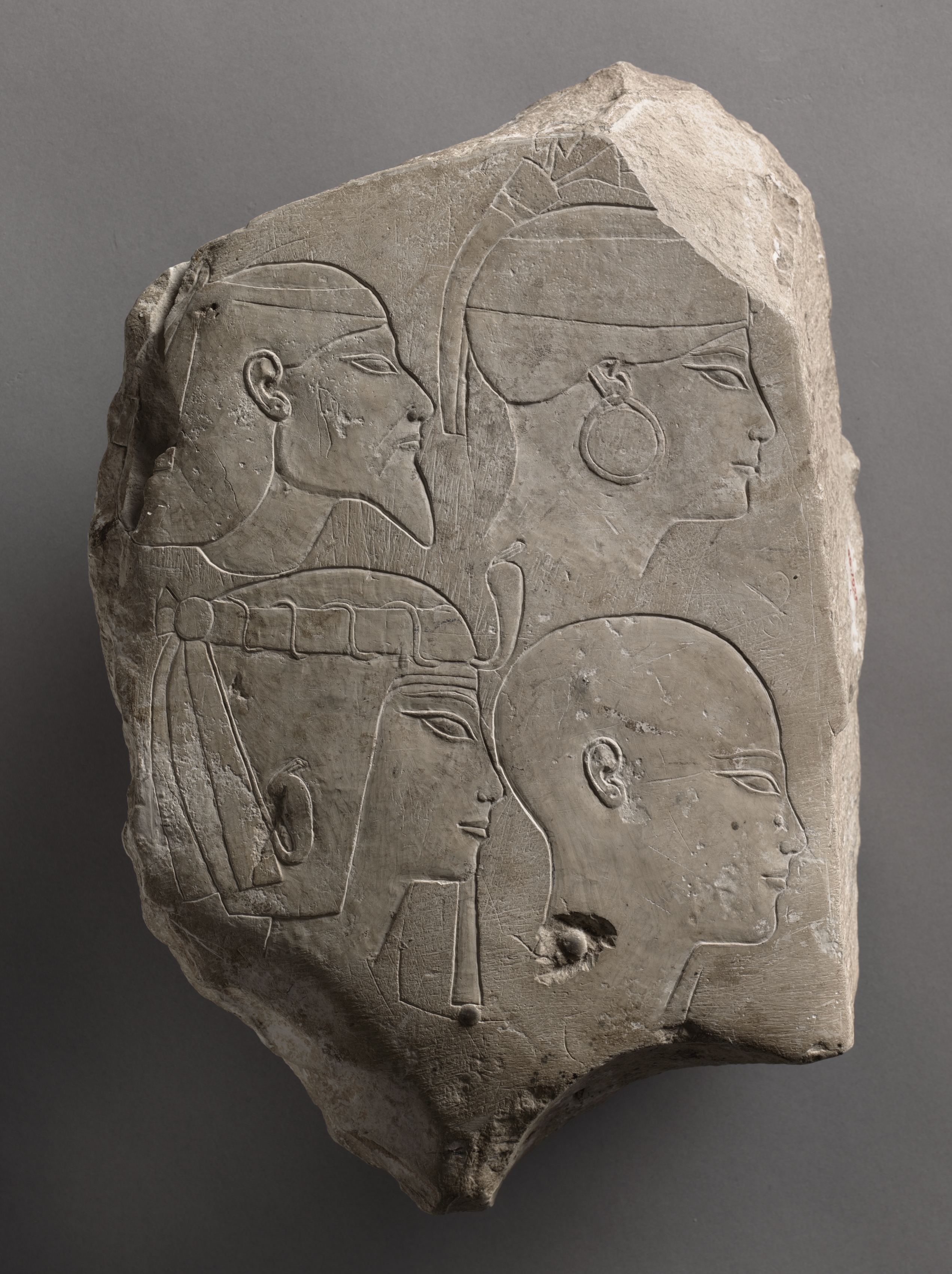 Gray stone fragment with four carved faces in profile. The top two faces are of a woman and a man. The woman's face has a large earring. The man's face is on the left, and he has a headband. The bottom two faces are of a man and a woman. The man's face is on the bottom right; he has a shaved head. The woman's face is on the bottom left; she has her hair styled back with a headband. The background of the image is gray.