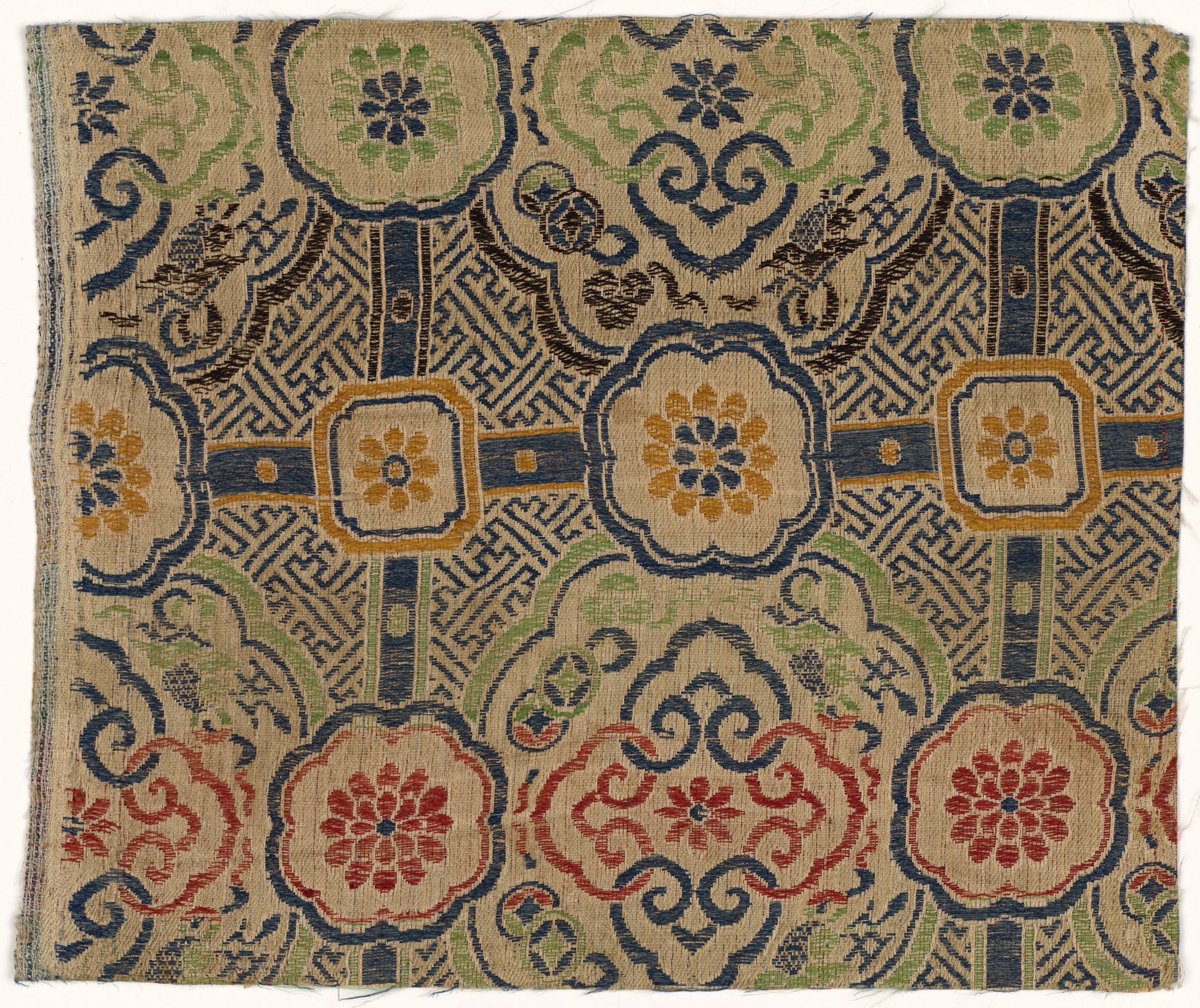 Beige textile with a repeating pattern. The pattern consists of four-petaled flowers in red, yellow, green, and blue. The flowers have blue outlines and are surrounded by curled blue lines. The flowers alternate in rows. Blue and yellow squares with a flower pattern are in the center. The textile has a blue and green Greek key design in the background. The edges of the textile are frayed. The background behind the textile is white. The artist is unknown, and the title is "Textile Fragment".