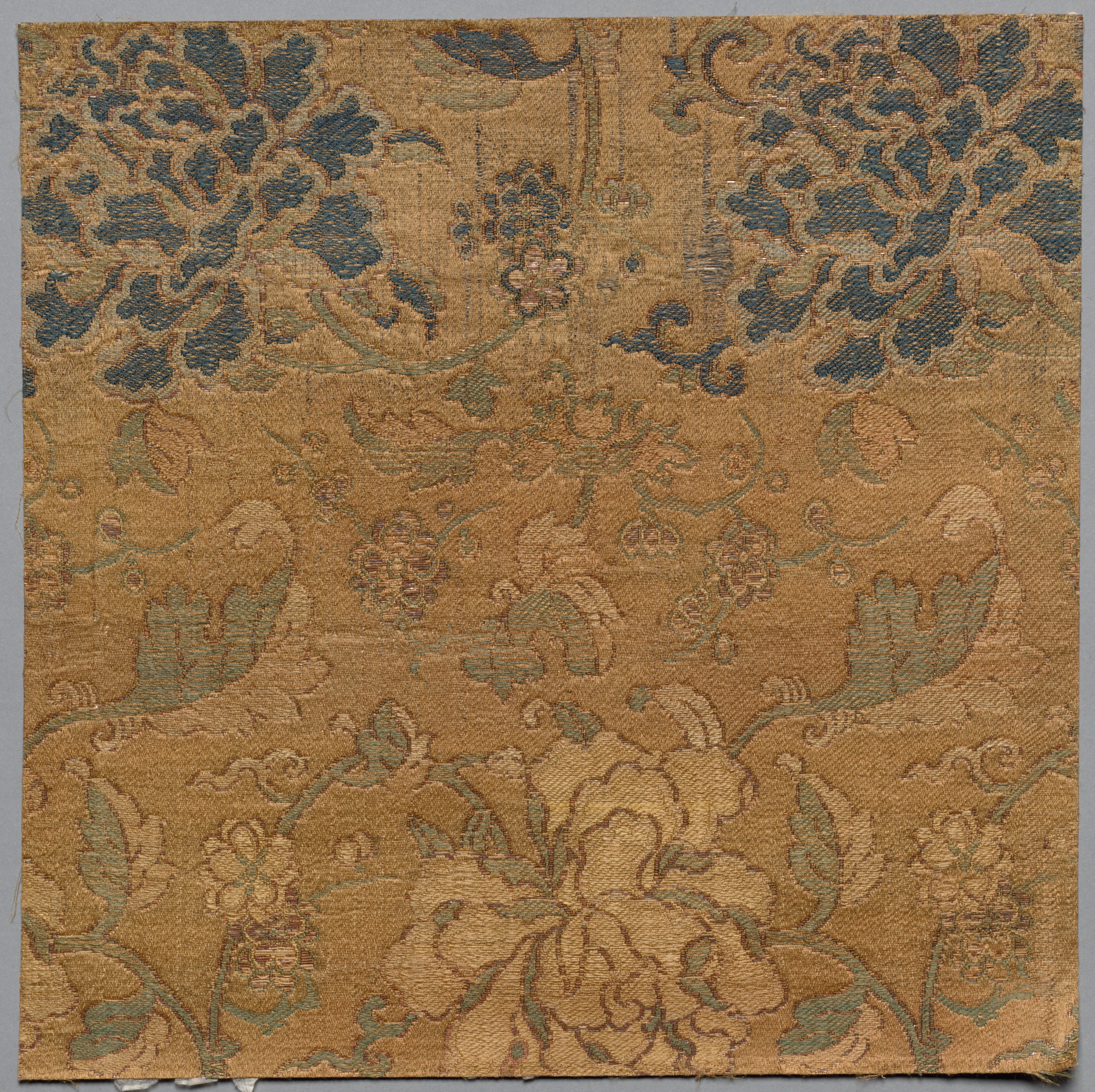 Golden-brown fabric with a floral pattern. The fabric is square-shaped. The floral pattern includes large flowers at the top and bottom, with smaller flowers and leaves throughout. The flowers and leaves are shades of blue-green. The background of the fabric is a golden-brown color. The edges of the fabric are rough and frayed. Fragment from Book of Textiles.
