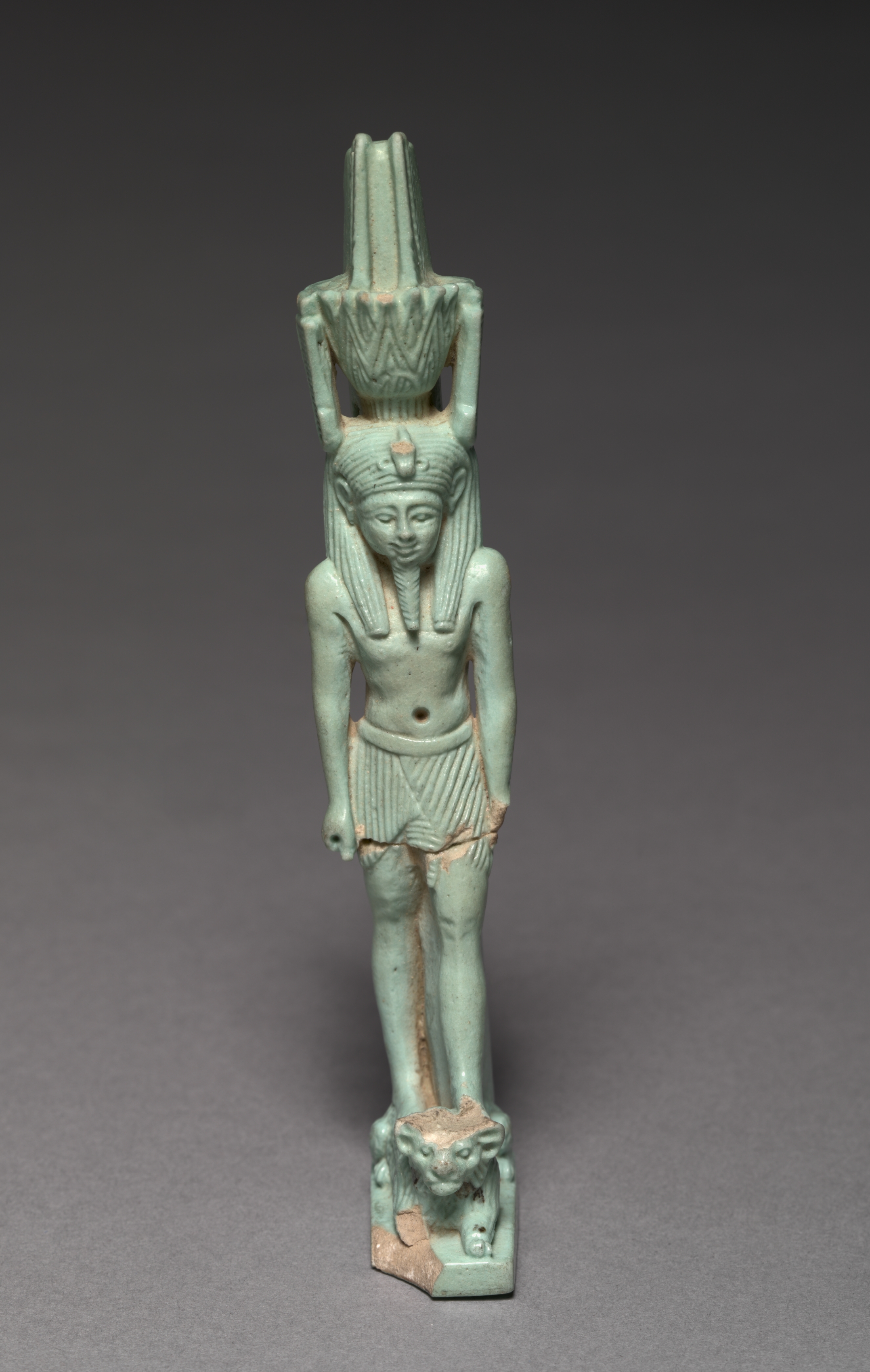 Greenish-blue ceramic or stone figurine of Nefertem, an Egyptian deity. The figure is standing on a square base with a lion's head on the front. The figure has a long skirt and a large headdress on their head. Their face is long with a slight smile and they have long hair. The figure's arms are at their sides. The object has some brown discoloration around the edges. The background is dark gray.