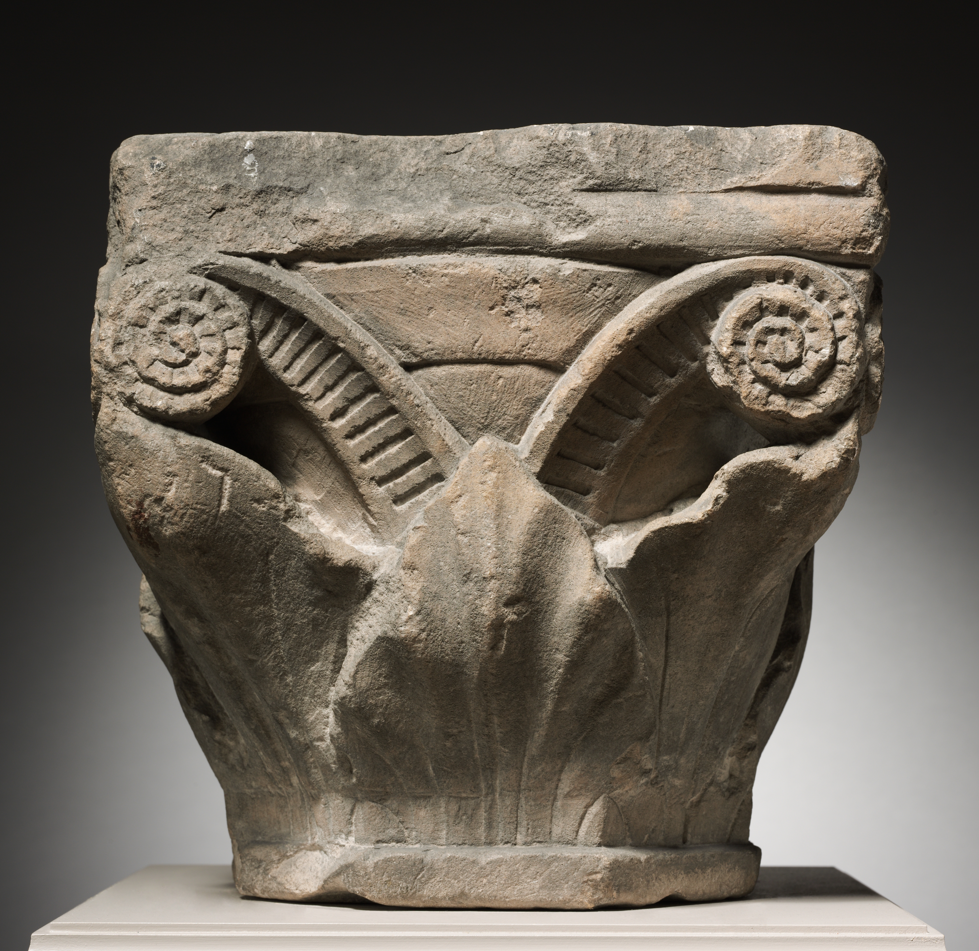 Capital by artist, stone architectural carving, gray stone, rectangular top, decorative carvings on the front, scroll-like designs on either side, decorative element resembling an upside-down flower or lotus blossom at the bottom, sits on a white base against a gradient background.