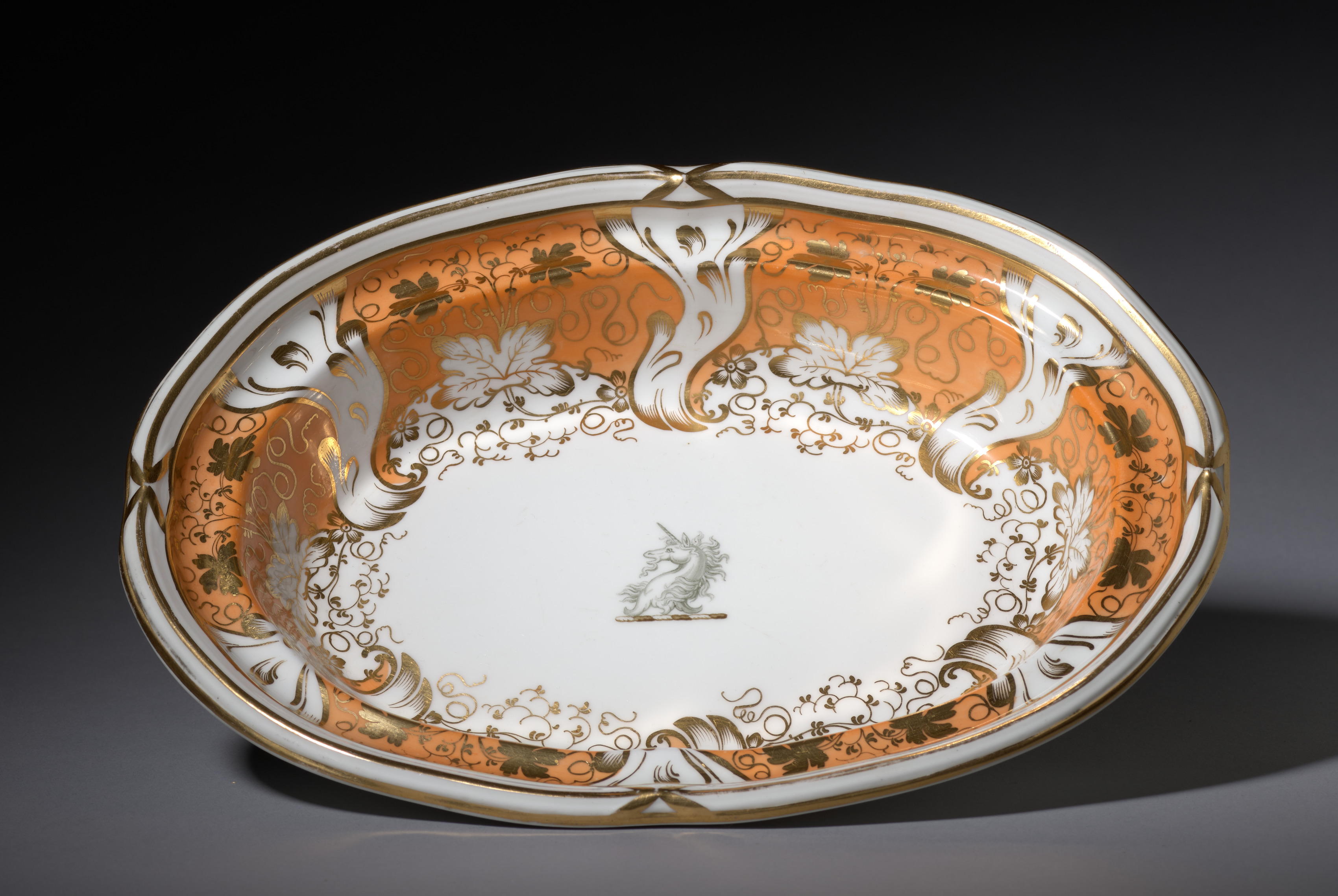Oval dish with white interior and orange, gold and white exterior; two white curved tree trunks on either side; white flowers and gold leaves and curled lines on interior; small gray bird in center; gold around rim; sits on gray surface against black background. Vegetable Dish by Davenport Pottery and Porcelain Factory.