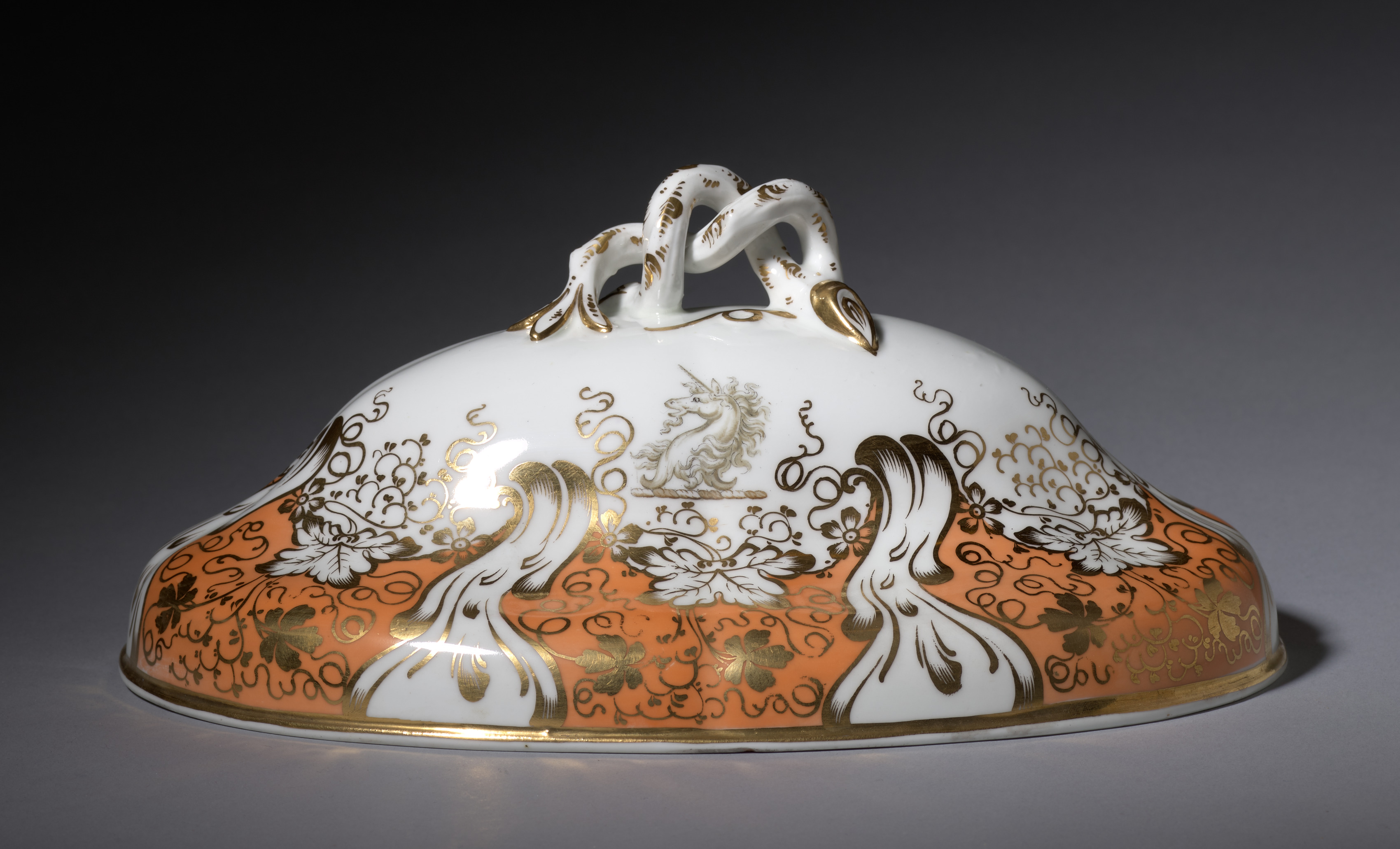 White porcelain lid with a domed shape and a handle on top featuring two swans. The lid has a white top section with gold accents and a light grey image of a sea creature. The bottom section is orange with white flowers and gold accents. The entire lid is decorated with gold swirling patterns. The background of the image is dark grey.