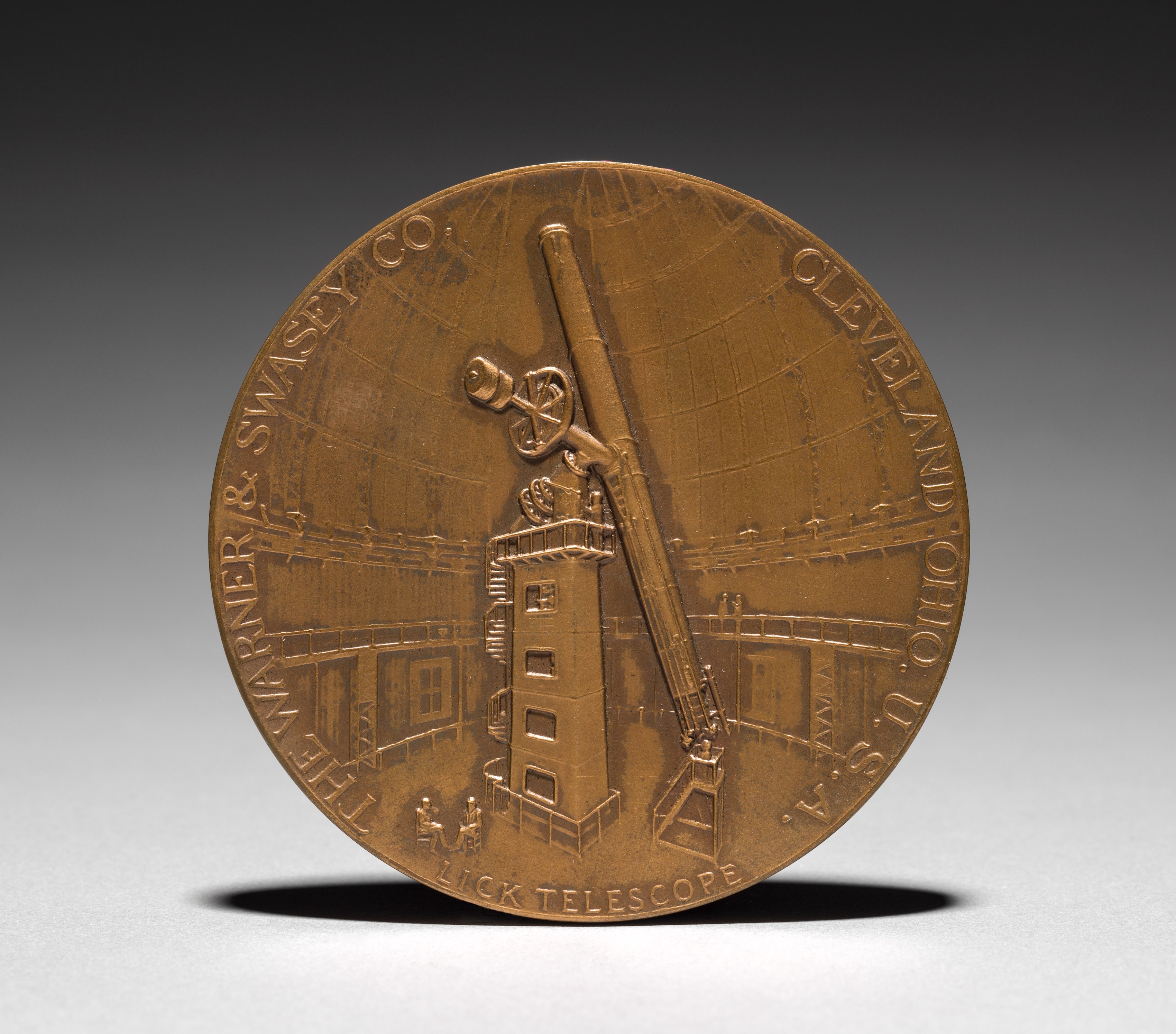 Bronze-colored medal with raised images and text. The medal shows a building with a long telescope on a mount on top. The telescope extends diagonally across the medal. The building has a tower with 3 visible rectangular windows and a railing around it. A person stands to the left of the tower. The text "THE WARNER & SWASEY CO." is along the top left edge. The text "CLEVELAND, OHIO" is along the top right edge. The text "40 FOOT TELESCOPE" is along the bottom edge. The background image shows a building with railings and people. The medal is on a gray background with a black shadow underneath.