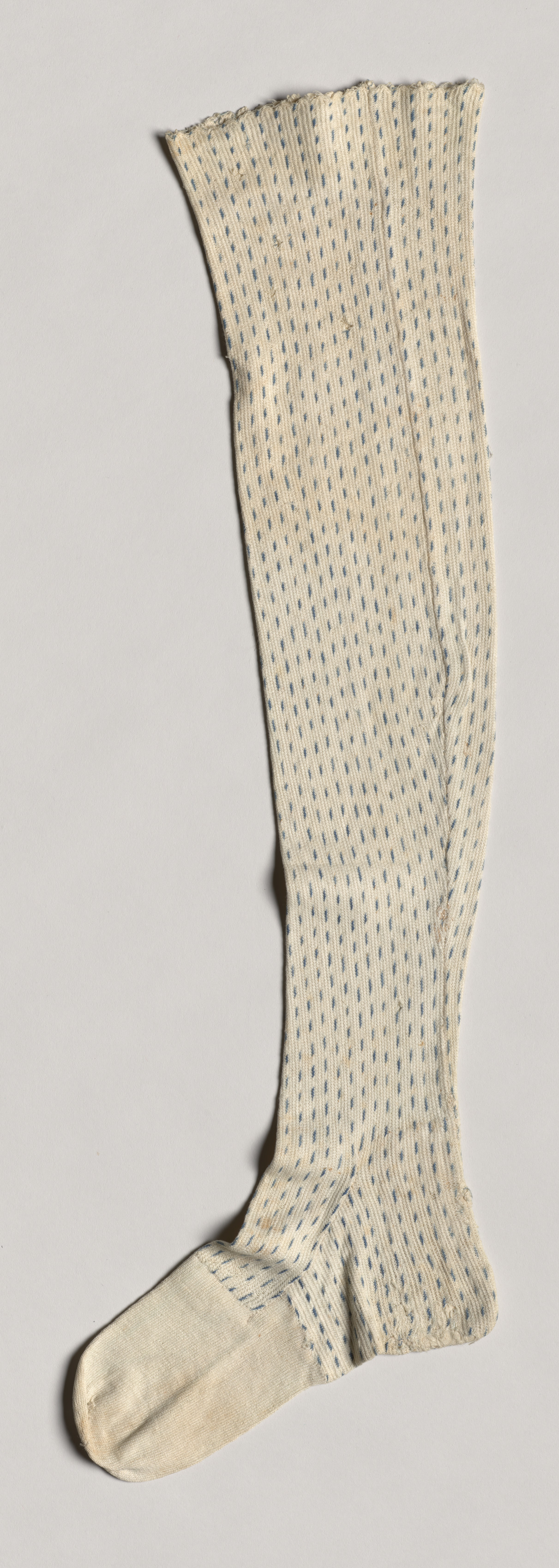 Stocking by Matisse. The image shows a cream-colored stocking. The stocking features a pattern of small, thin, blue dashes or lines. It has a ribbed texture. The heel and toe areas are solid cream-colored. The stocking is knee-high. The background is light gray. A shadow is cast to the left.