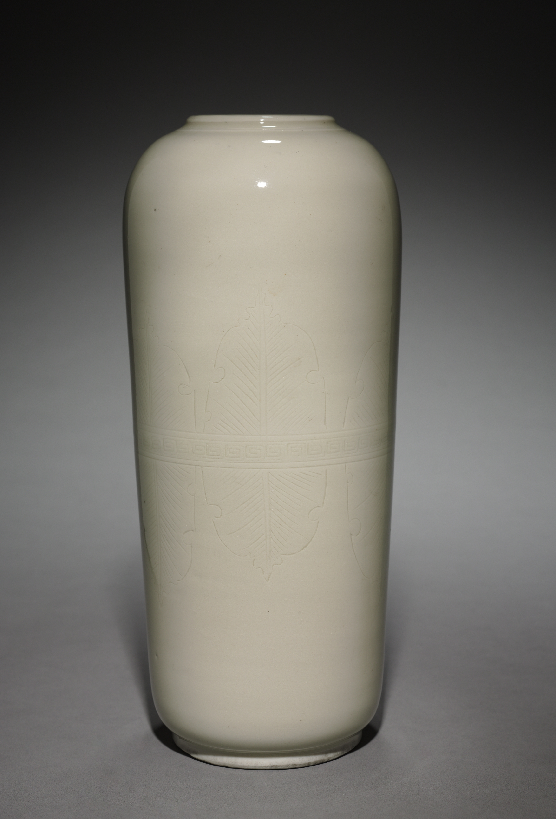 White vase, tall and narrow with rounded edges at top and bottom, small lip at top. Embossed design around middle with a band across, featuring four identical motifs. Background fades from dark at top to light gray at bottom. Vase, artist not specified.