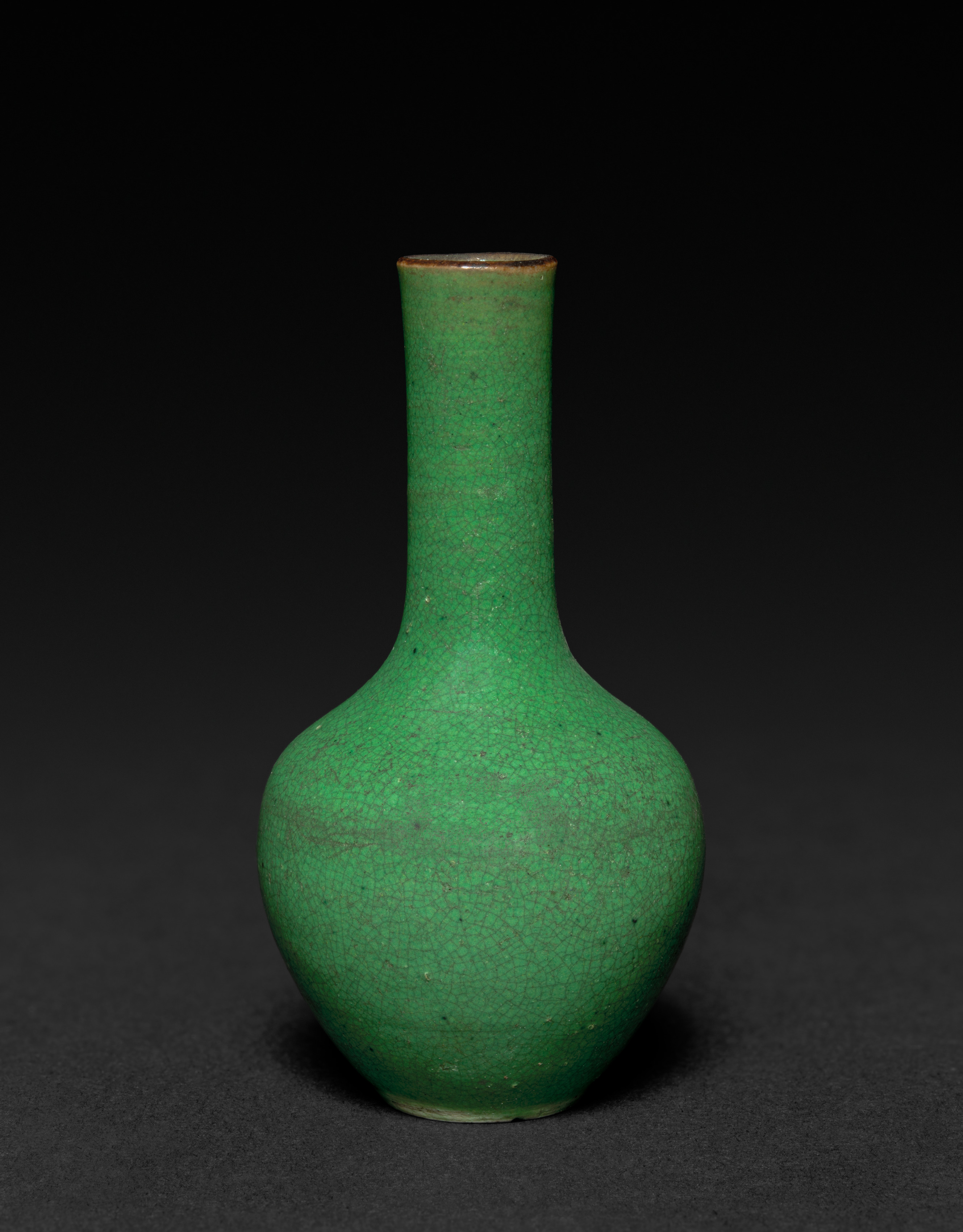 The vase by artist Koetsu is green with a crackle glaze. The body of the vase is bulbous and rounded with a short narrow neck that flares out slightly at the rim. The base of the vase is small. The glaze is primarily green with a brown rim. The background is dark gray to black.