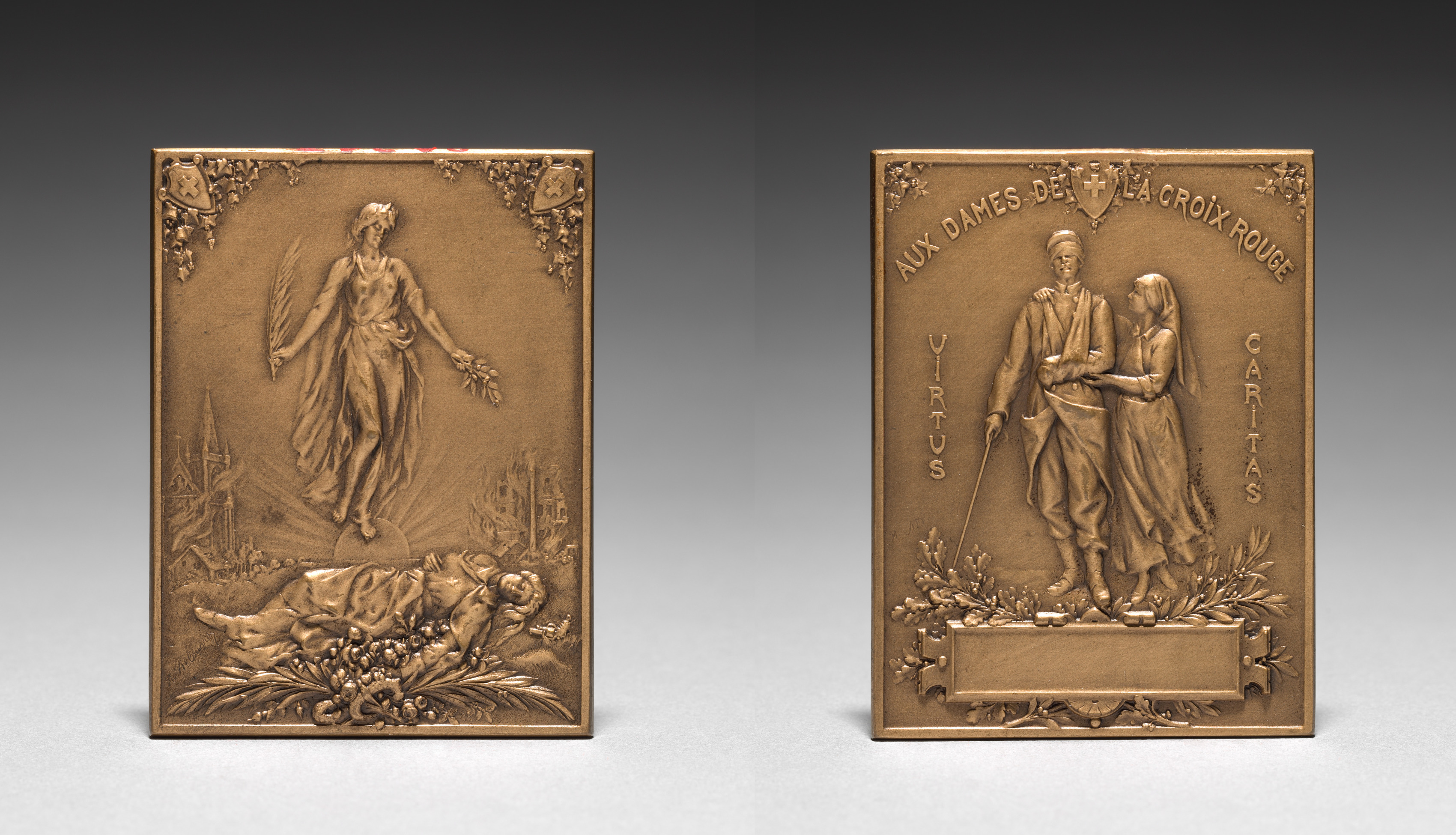 Medallion by Henri Emile Allouard. Two rectangular bronze medallions. Left medallion: A woman standing on a globe, wearing a short flowing dress, and a laurel wreath on her head. She holds a palm branch in her right hand and a bunch of flowers in her left hand. A lion lies at her feet, and a building resembling a church is visible in the background. Right medallion: A man and two women. The man wears a suit and hat, and holds a cane. The two women wear long dresses and one of them wears a veil. Inscriptions on the right medallion include 'VIRTUS', 'CARITAS', 'AUX DAMES DE', and 'LA CROIX ROUGE'. Both medallions have decorative borders with leaves and flowers.