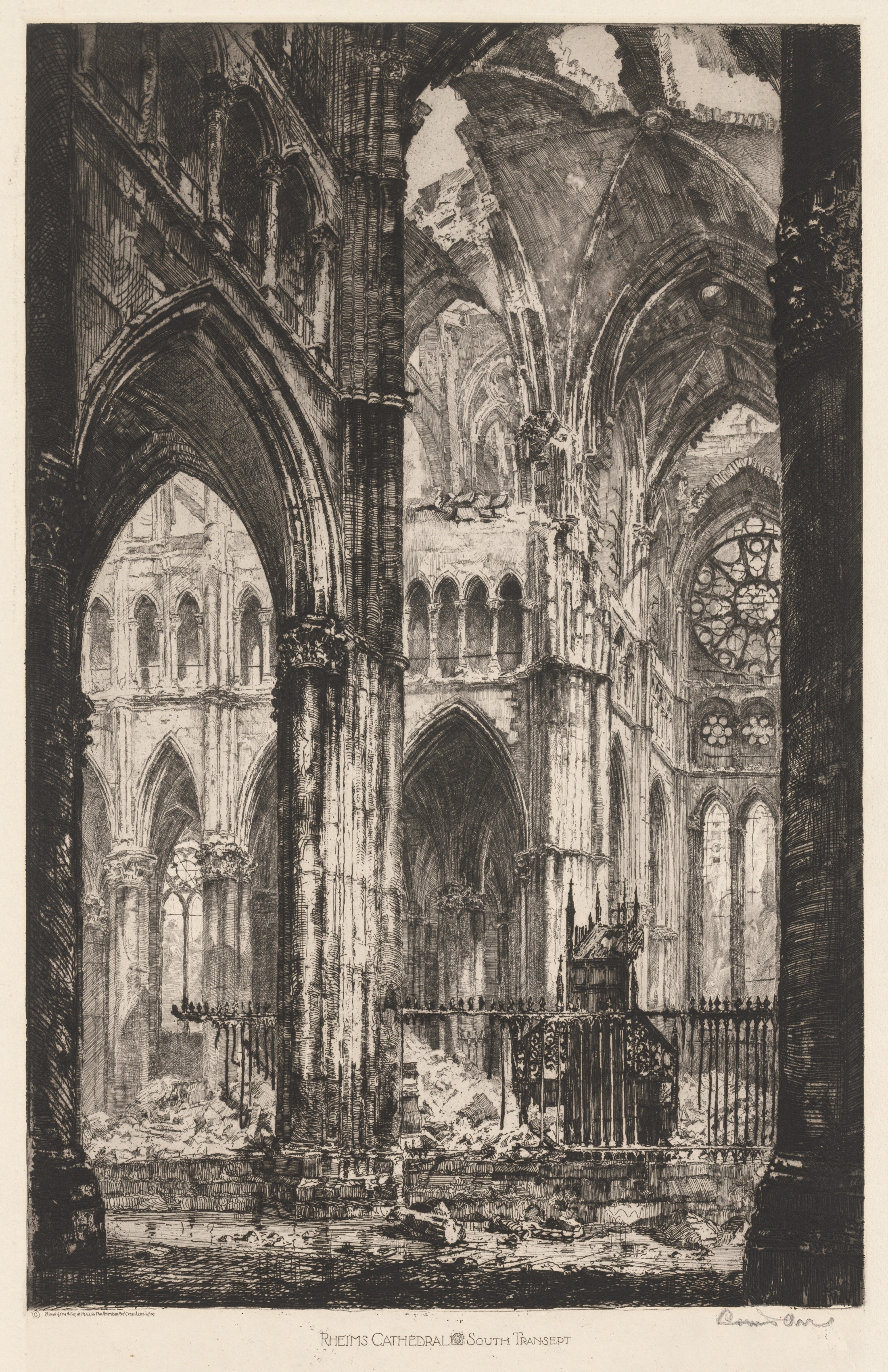 Black and white drawing of interior of cathedral. Damaged roof shows patches of daylight. Large pointed arches connect to columns and support roof. Large circular stained glass window on right wall. Rubble on floor; wrought iron fence in foreground.