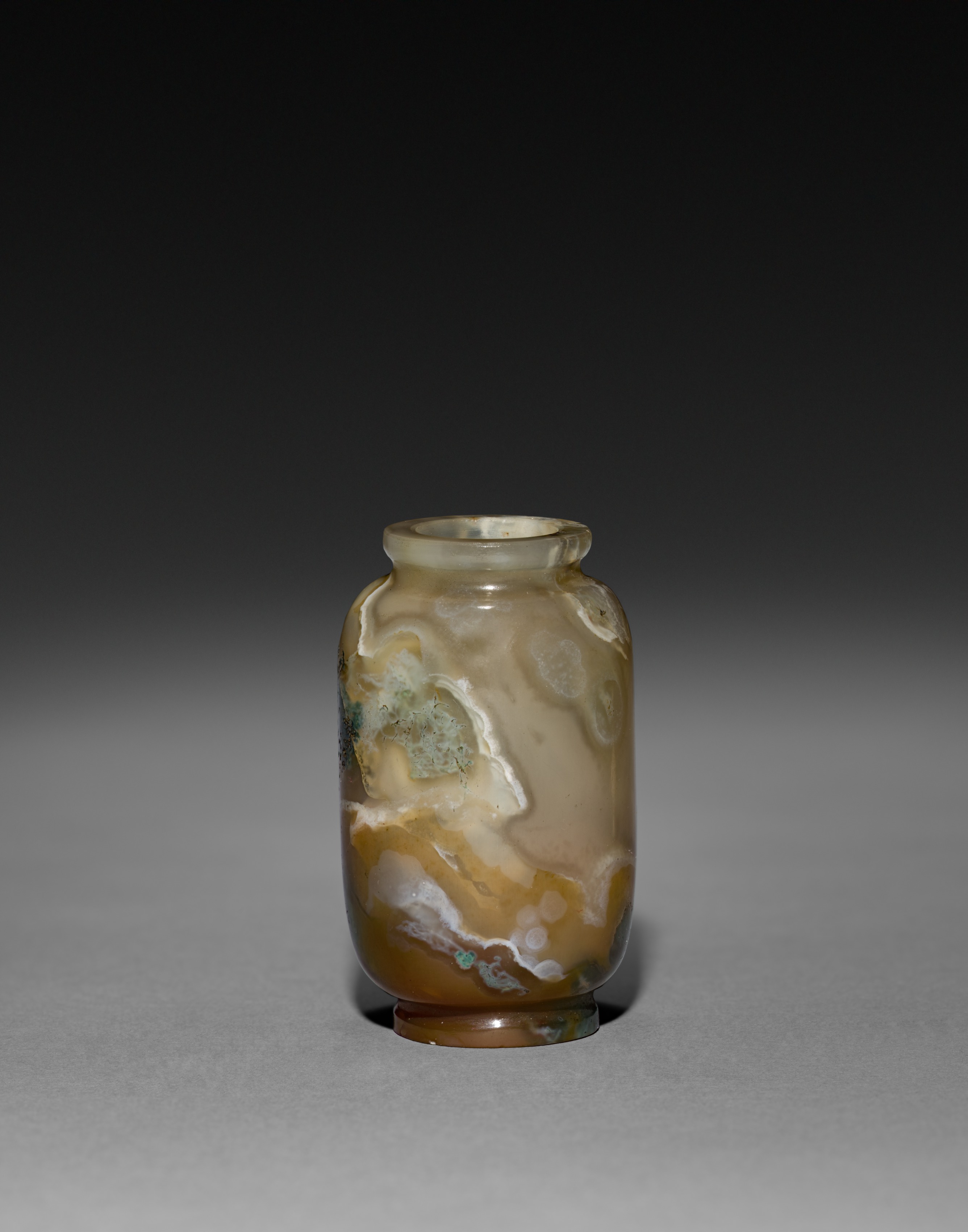 The Snuff Bottle by René Lalique features a cylindrical body made from a material that blends shades of brown, beige, and white, giving it a marbled appearance. The bottle's surface shows variations in color and texture. A small, rounded lip defines the mouth of the bottle. The base is flat and sturdy. The background transitions from dark at the top to light gray at the bottom.