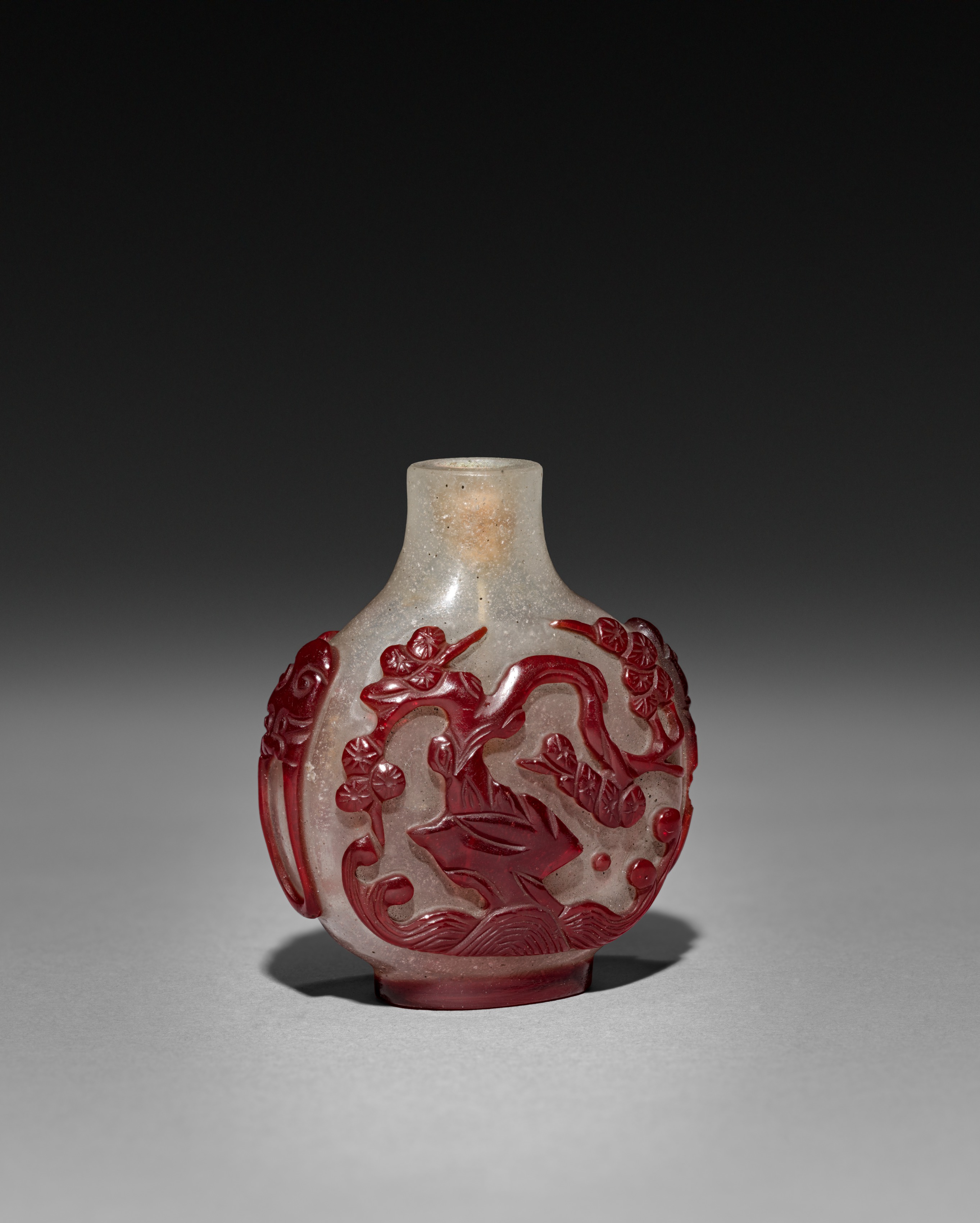 The Snuff Bottle by Imperial Workshop, is a small, rounded vessel made of opaque white material with a short neck and wide body. The body features a red carved design depicting a dragon and other motifs. The background of the image transitions from dark to light gray.