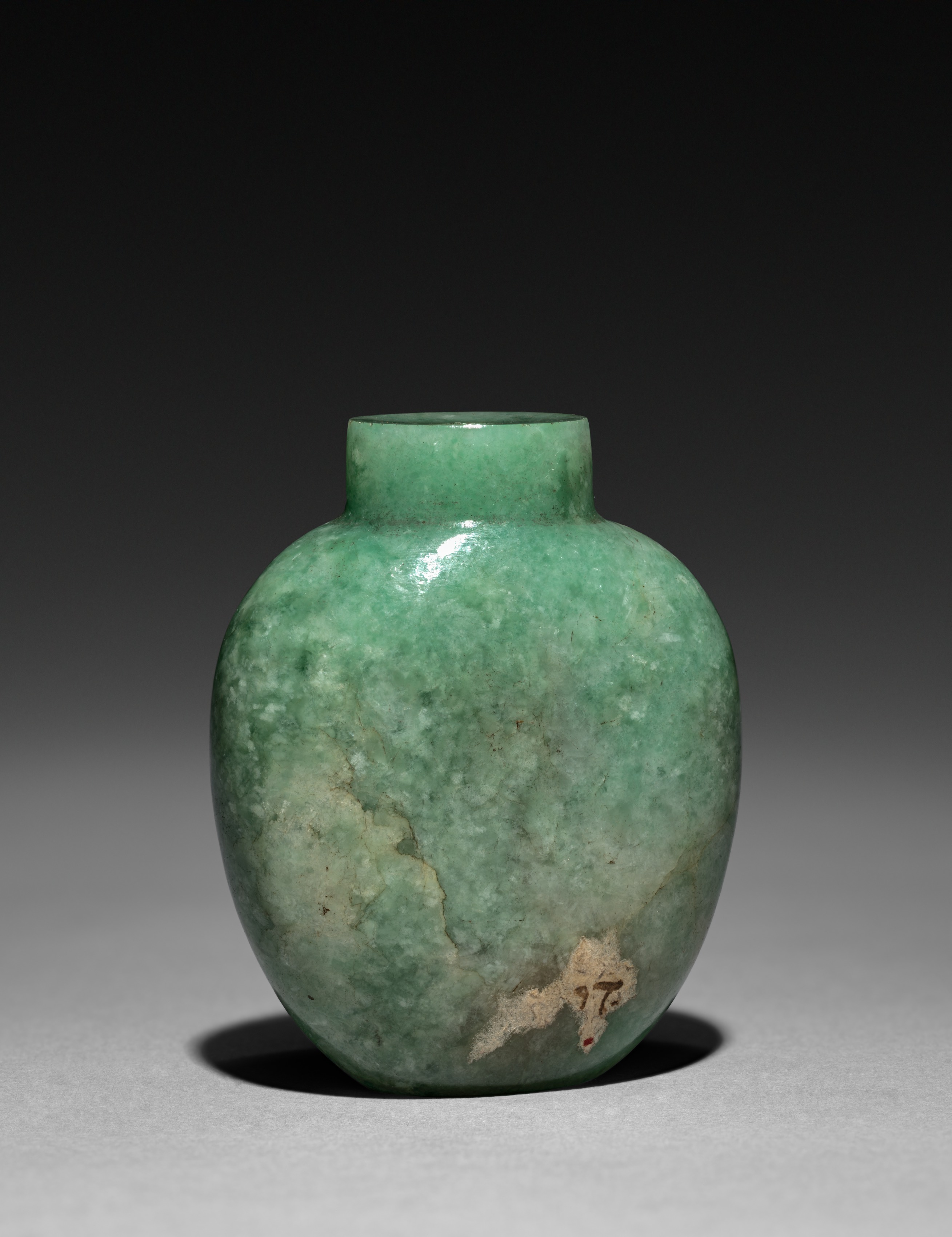 Green jade snuff bottle with a rounded body and short neck. Mottled green color with some darker and lighter patches. Specks of white and beige on lower part. A small beige patch with 77 written on it. The background is dark gray to light grey gradient.