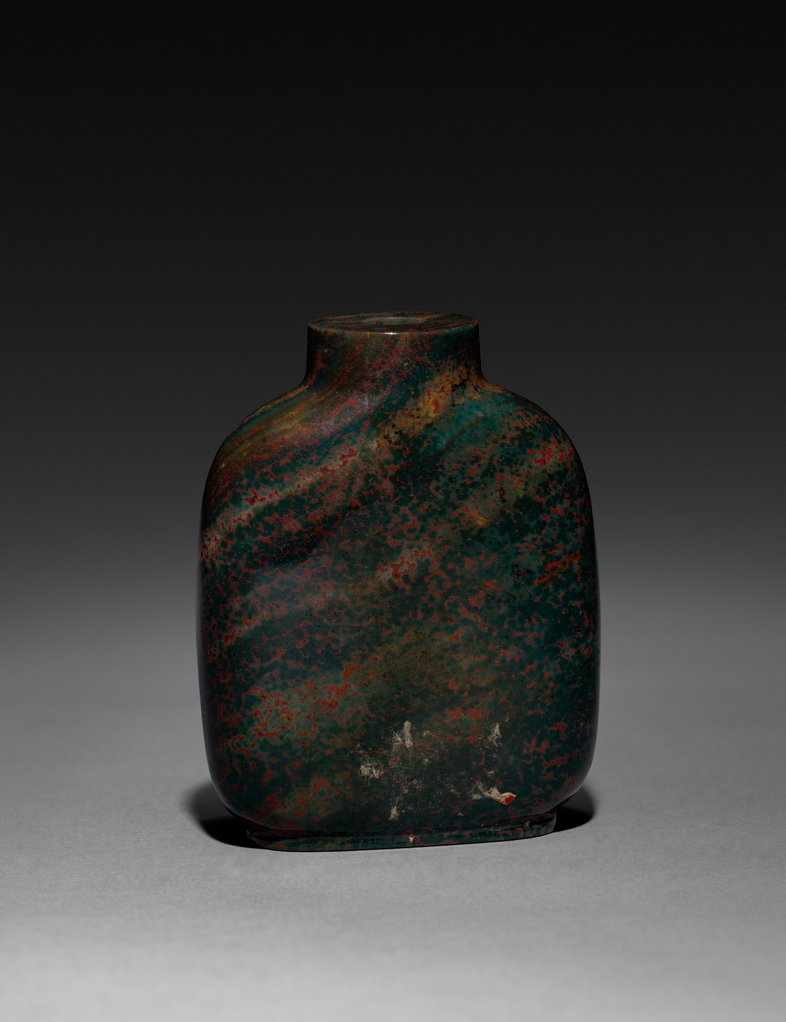 Snuff Bottle by artist Pu Ru is a rounded, dark-colored snuff bottle with a short neck and wide body that curves inwards at the base; the body exhibits a predominantly green and red patina with patches of white.