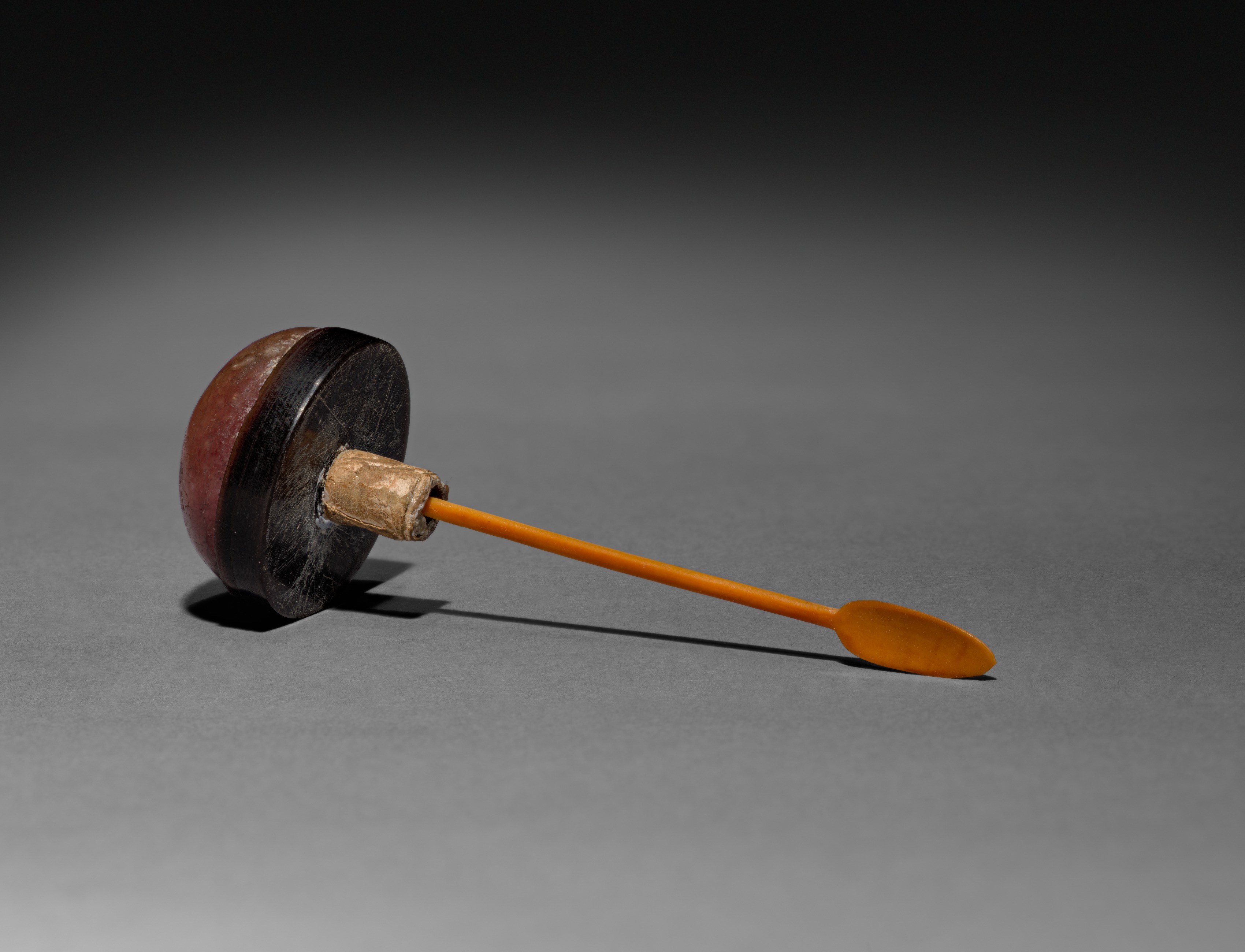 Red and black snuff bottle stopper with a long orange spoon attached. The stopper is circular, made of red and black material, possibly stone or wood, with a small cylindrical piece of beige material, likely wood, protruding from the center. The orange spoon is long and thin, with a rounded end. Gray background with dark vignette.