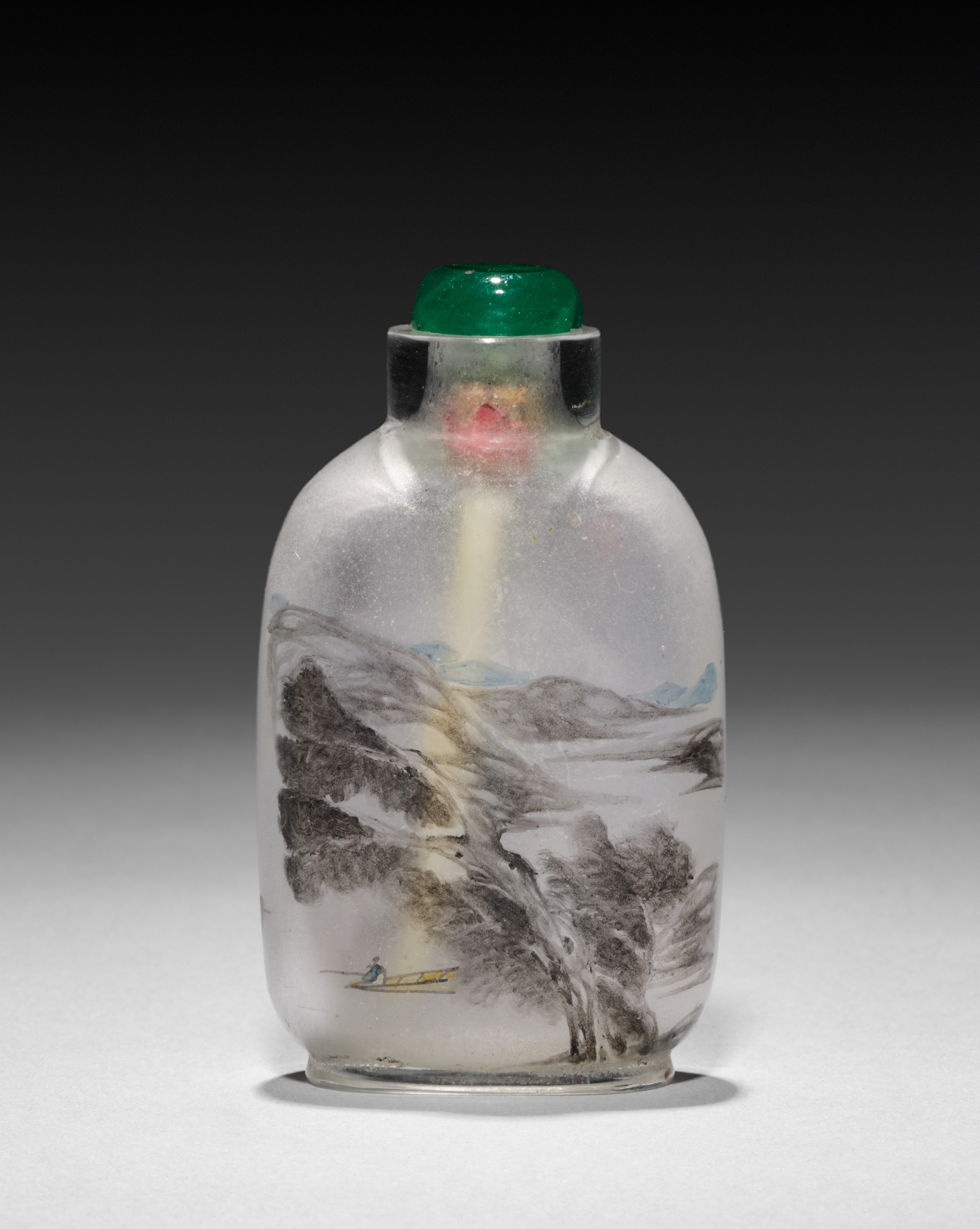 The Snuff Bottle by an unknown artist is a clear, rounded rectangular snuff bottle with a green stopper on top. The bottle features a black and white landscape painting depicting a mountainous scene with trees and a body of water. A small boat with a person is visible on the water. The background of the image is dark gray, gradually transitioning to light gray at the bottom. The bottle appears to be made of glass or crystal.