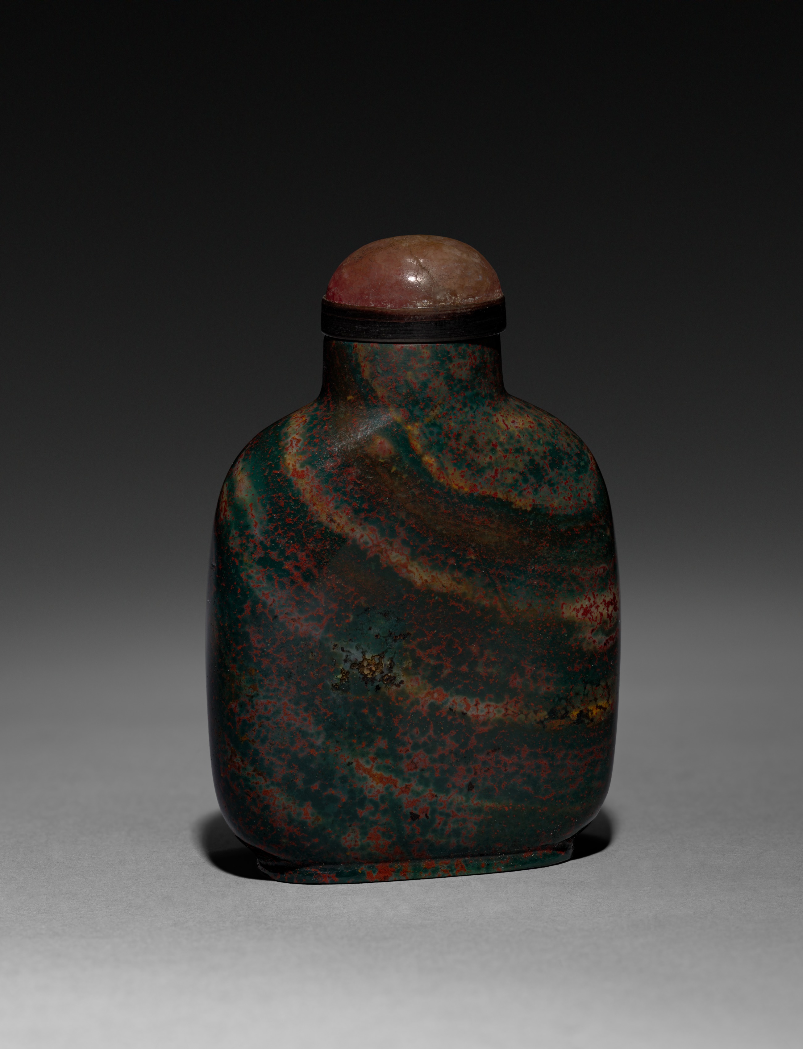 Snuff Bottle by artist. The object is a rounded, dark green and reddish-brown snuff bottle with a rounded stopper. The bottle's body is predominantly green with red and brown marbling. A black band encircles the top of the bottle. The rounded stopper on top is a similar brown color. The background is dark gray to light grey at bottom. The object casts a shadow to the left.