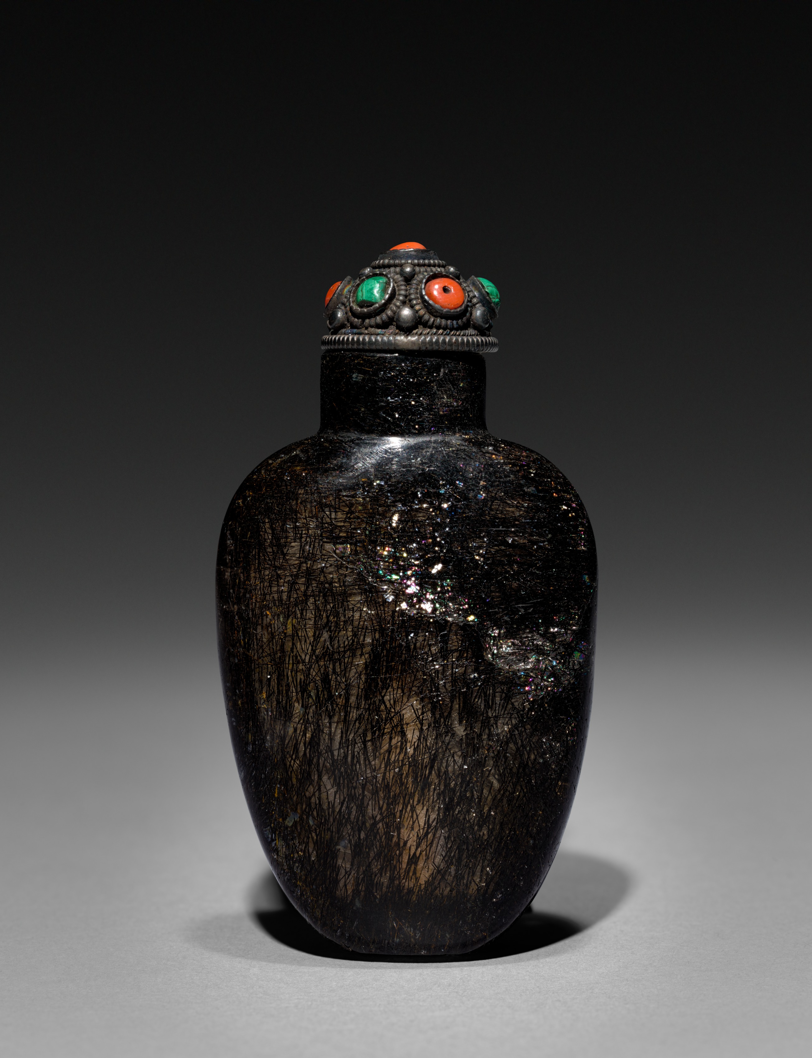 Snuff Bottle by artist not specified, small, rounded vessel made of dark brown or black material with gold flecks, resembling stone or glass, features a short, narrow neck and a rounded body, the lid is adorned with five circular colorful gems or beads in a metal bezel, three are orange-red and two are green, arranged in a row across the top of the lid, has a small lip around the edge of the lid and neck, the surface of the body appears to have hair-like inclusions or scratches.