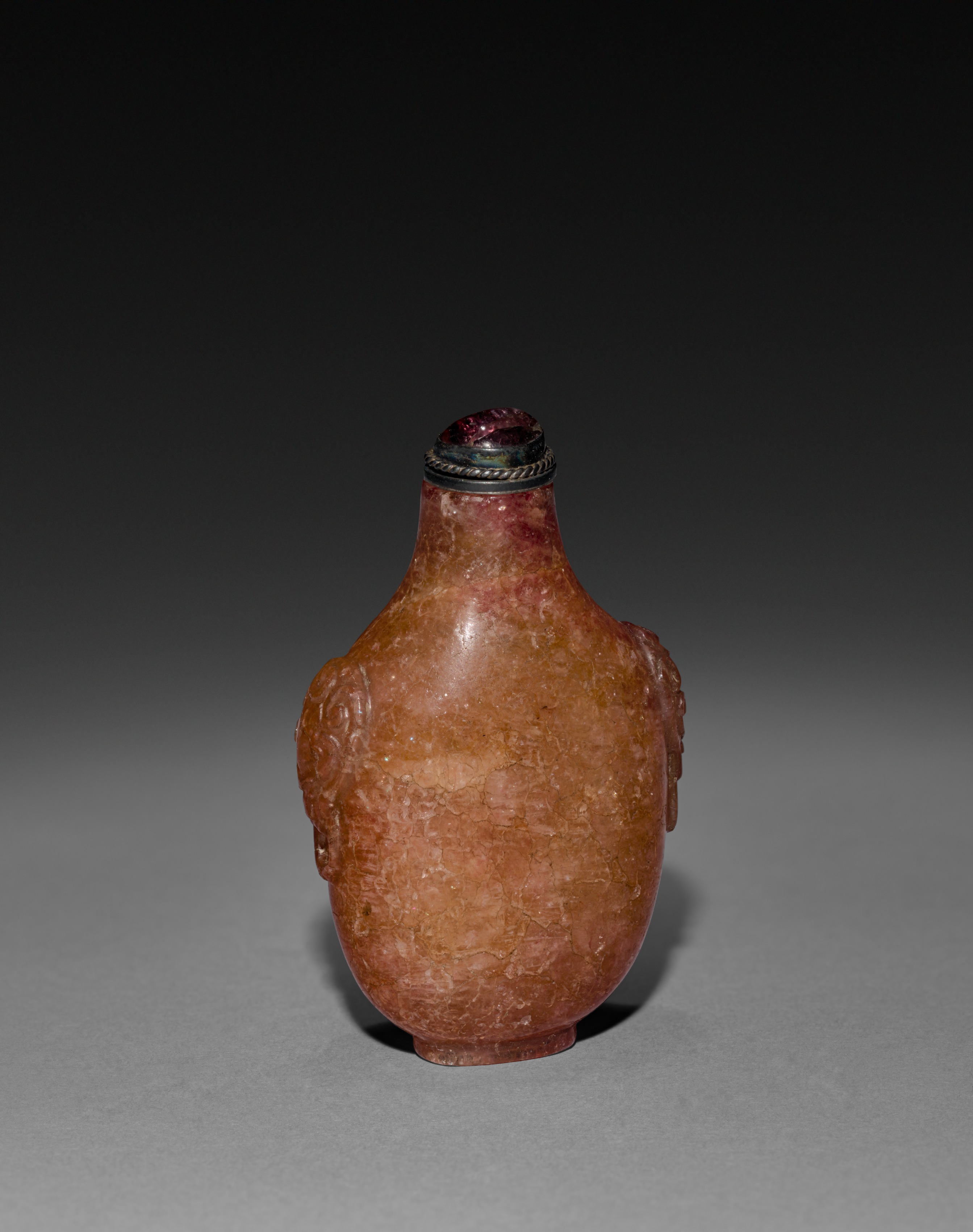 The Snuff Bottle by unknown artist depicts a reddish-brown snuff bottle with a textured surface. Made of carved stone or crystal; the bottle has a rounded body with a narrower neck. A metal cap with a red gemstone tops the bottle. Four small feet are at the bottom. The background fades from dark at the top to light at the bottom.
