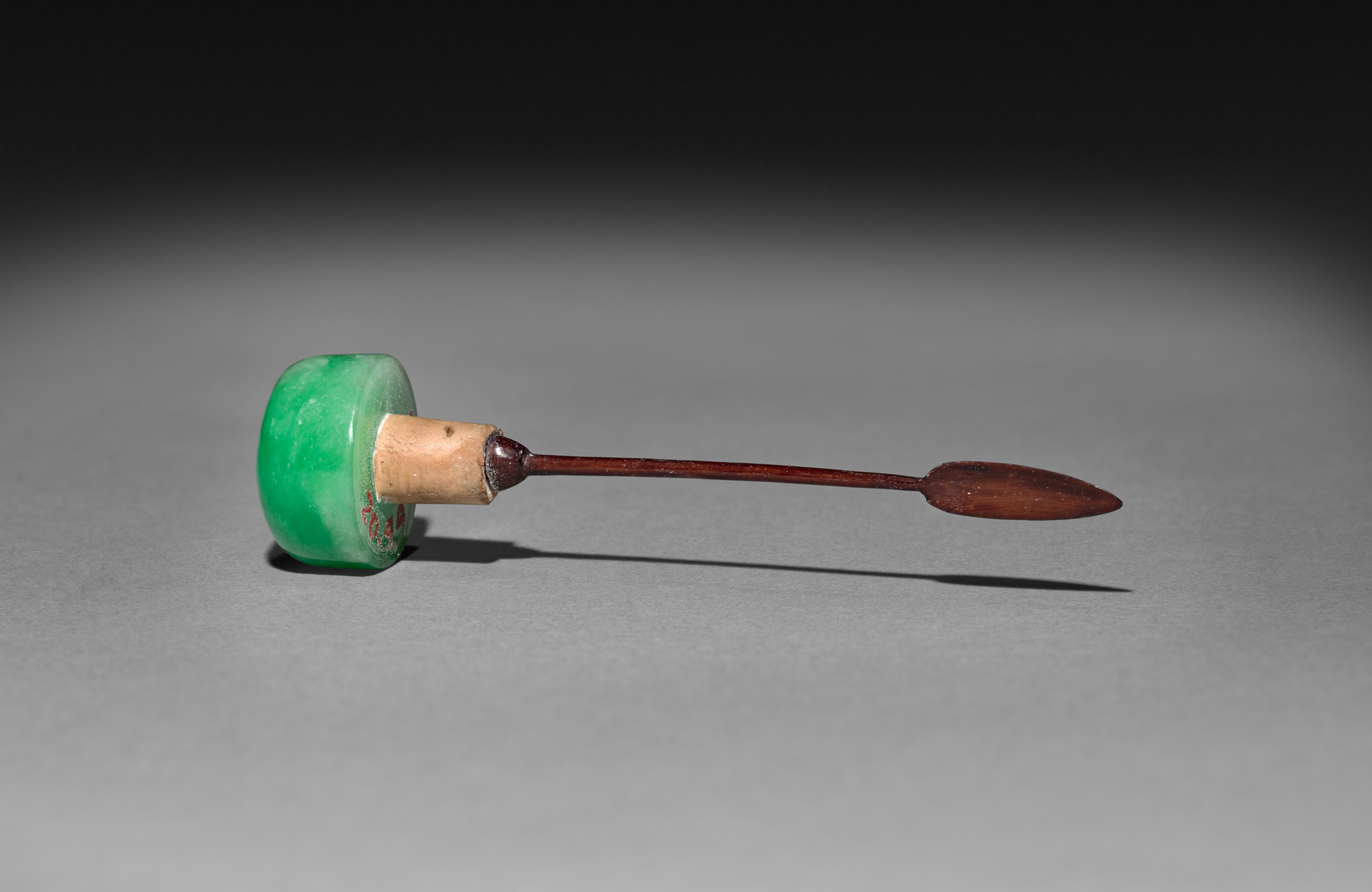 The stopper is made of green stone. The stone is semi-translucent and has a rounded rectangular shape. The stopper has red writing on its lower right side. A cylindrical piece of light-colored wood connects the stone to a long, thin handle. The handle is made of dark brown wood. The handle has a rounded tip. The background is gray with a black vignette. The object is titled "Snuff Bottle (stopper)" and was made by an unnamed artist.