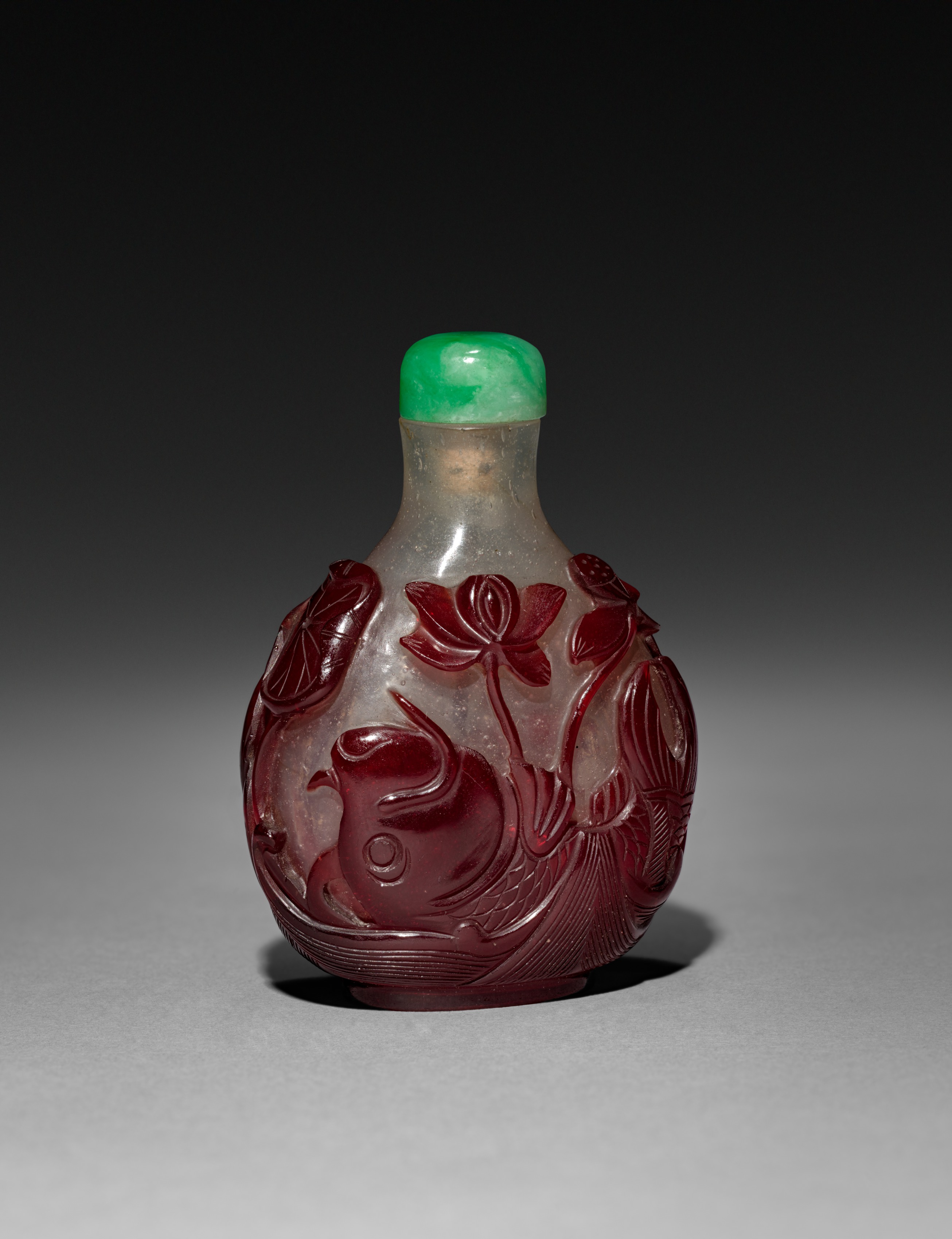 The Snuff Bottle by an unknown artist depicts a red and clear glass snuff bottle with a green stopper. The bottle features a bulbous body with a narrow neck and a rounded green stopper on top. The body of the bottle is primarily clear, transitioning to a deep red towards the bottom. It is adorned with intricate carvings of flowers and leaves in a deep red hue. The background of the image is dark at the top, gradually transitioning to light gray towards the bottom.