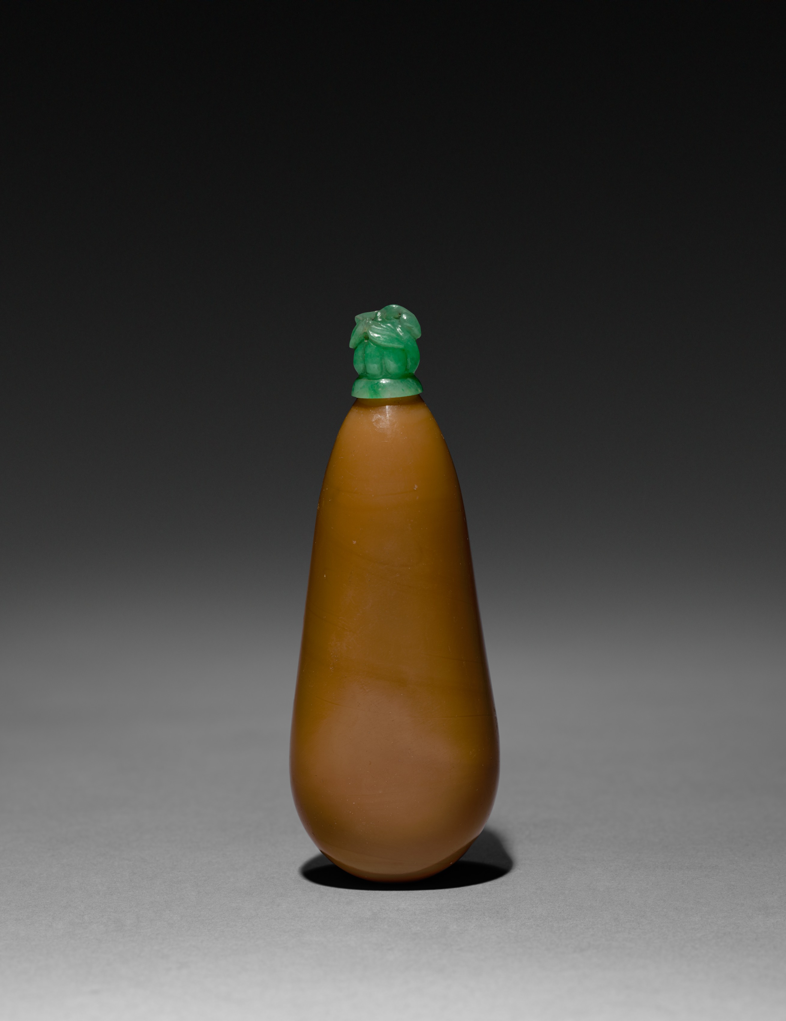 The Snuff Bottle by Republic Period artist, has an elongated oval body that tapers towards the top. The body of the snuff bottle is a shade of brown. A small jade stopper tops the snuff bottle; the jade stopper is carved with an animal figure. The snuff bottle casts a shadow on the surface below. The background is a gradient of dark to light gray.