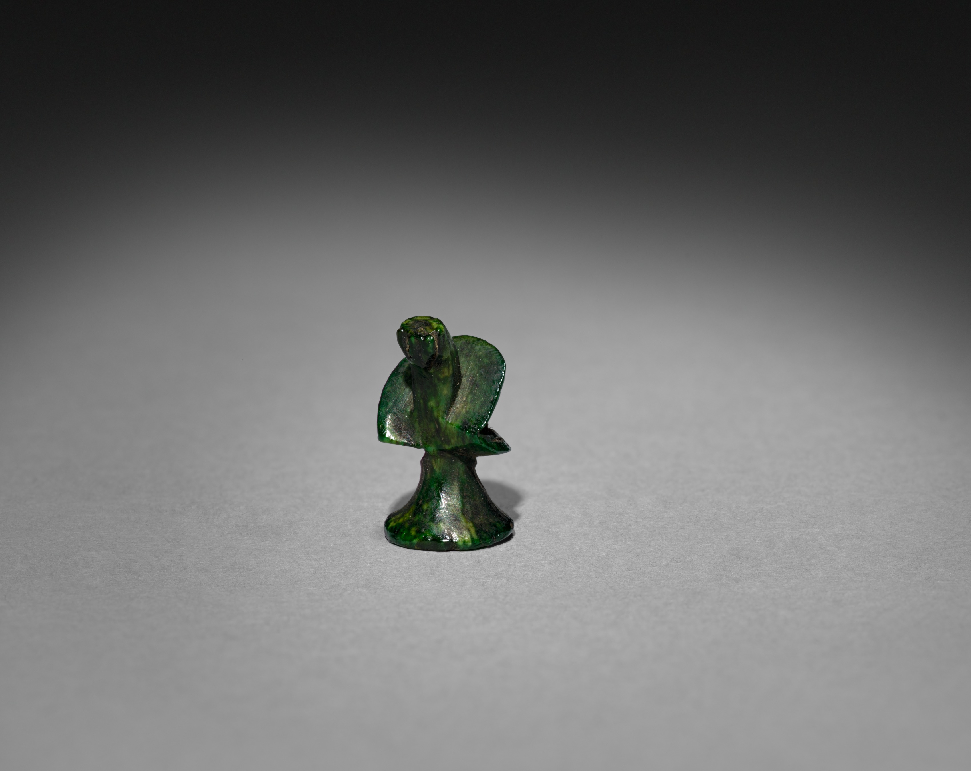 The stopper for a Snuff Bottle, titled and by an unknown artist, is a small, dark green object. The object has a flared base that tapers upward into a stem. A rounded element protrudes from the stem; the element features a head at its top and a curved element on one side. The entire object exhibits a mottled appearance, with variations in green hue and light reflection. It stands alone on a grey surface, with a shadow cast to one side. The background fades from black at the top to grey at the bottom.