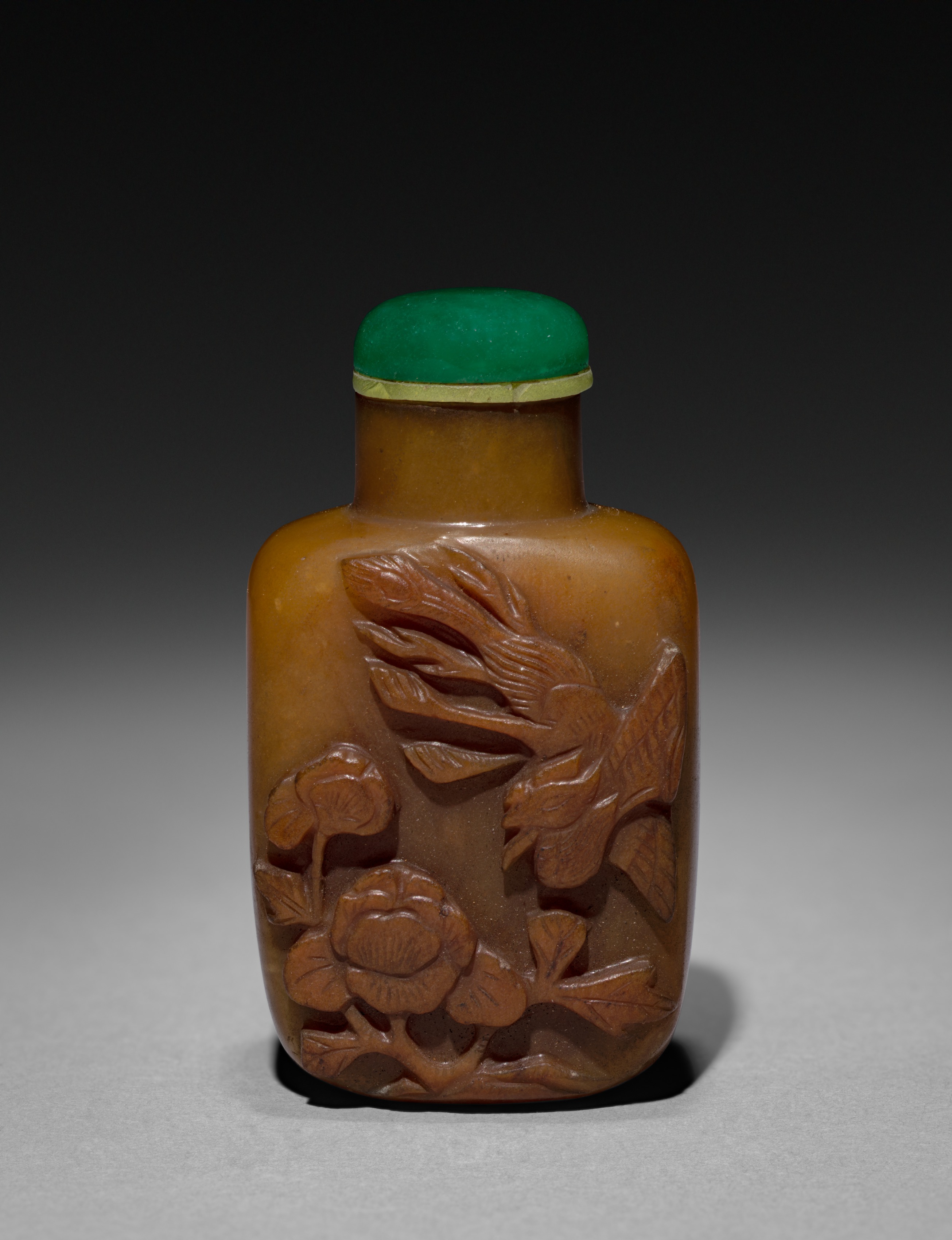 Snuff Bottle by an unknown artist. The bottle is made of brown material, likely a type of stone or resin, and has a rounded rectangular shape with a narrow neck. The bottle is carved with a design featuring a bird, possibly a crane, and flowers. The bird appears to be flying or in mid-flight. The cap is green with a thin gold band around its base. The background of the image is dark at the top and light at the bottom, with the bottle casting a shadow.