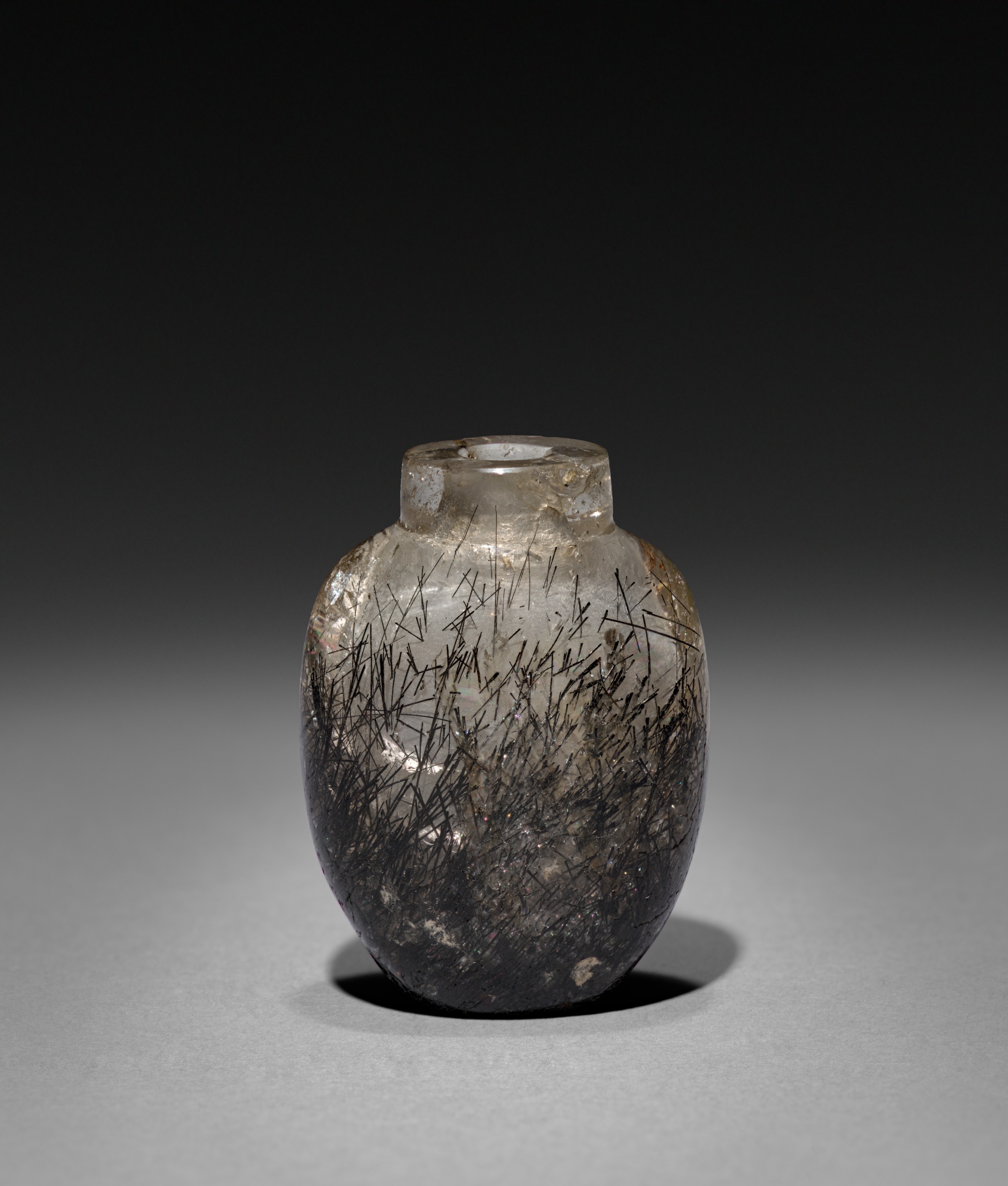 The "Snuff Bottle" is a rounded vessel with a narrow opening at the top. The bottom half of the bottle is dark gray with black streaks throughout and some lighter gray areas. The top half is a lighter color with many black streaks. The background is dark at the top and light at the bottom.
