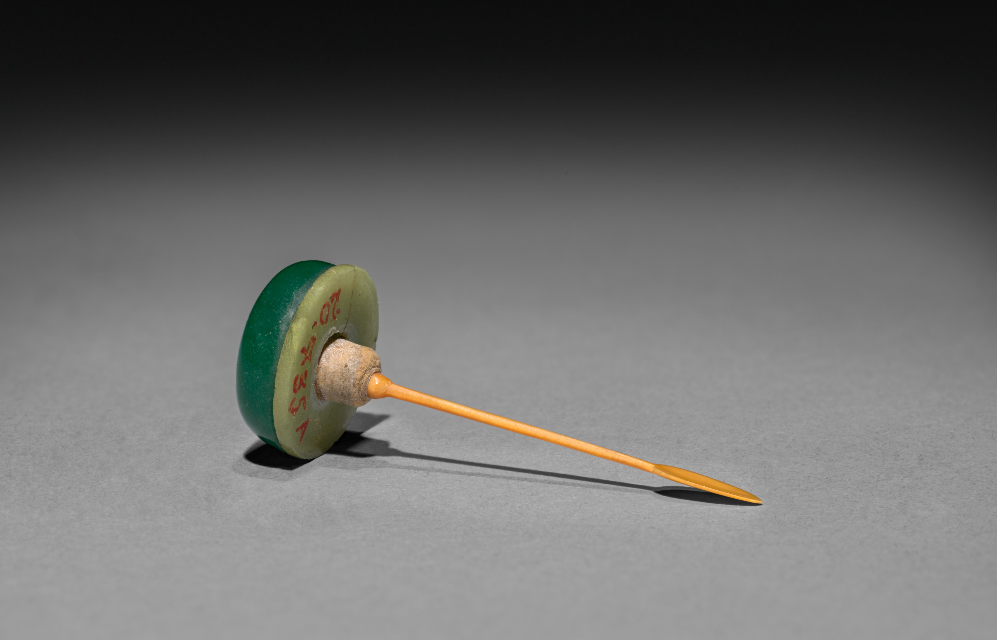 Green and yellow circular object with a cork center; a long orange point protrudes from the center. The circular object is positioned on its side, with the point extending to the right. The green and yellow parts have red writing on them. The background is gray with a black vignette. The object could be described as a stopper, by artist unknown, titled "Snuff Bottle".