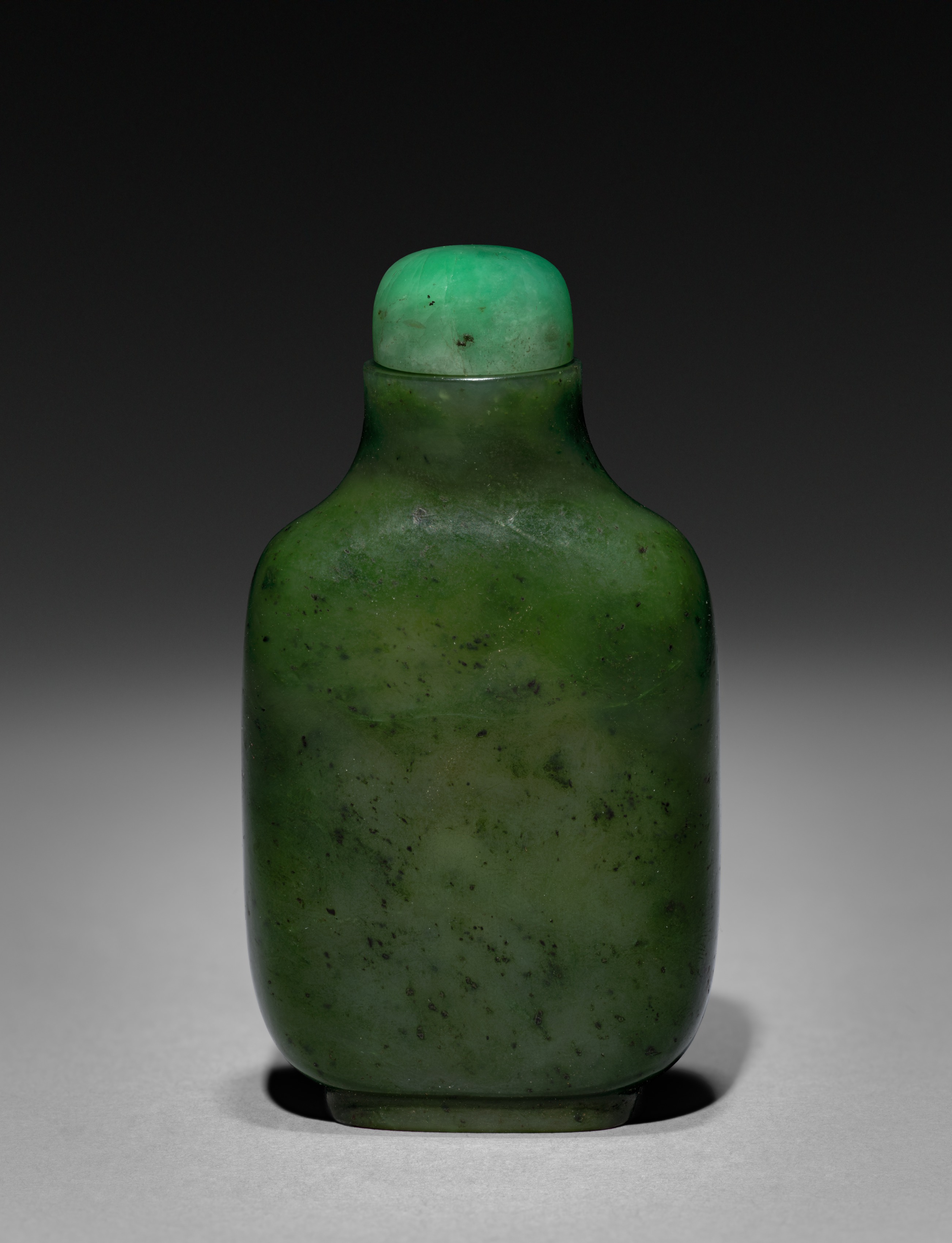 Snuff Bottle by artist. Green jade snuff bottle with darker green and black speckles; rounded rectangular body with rounded shoulders; short neck and rounded lip; rounded stopper; on a gray surface with a shadow to the right; dark background.
