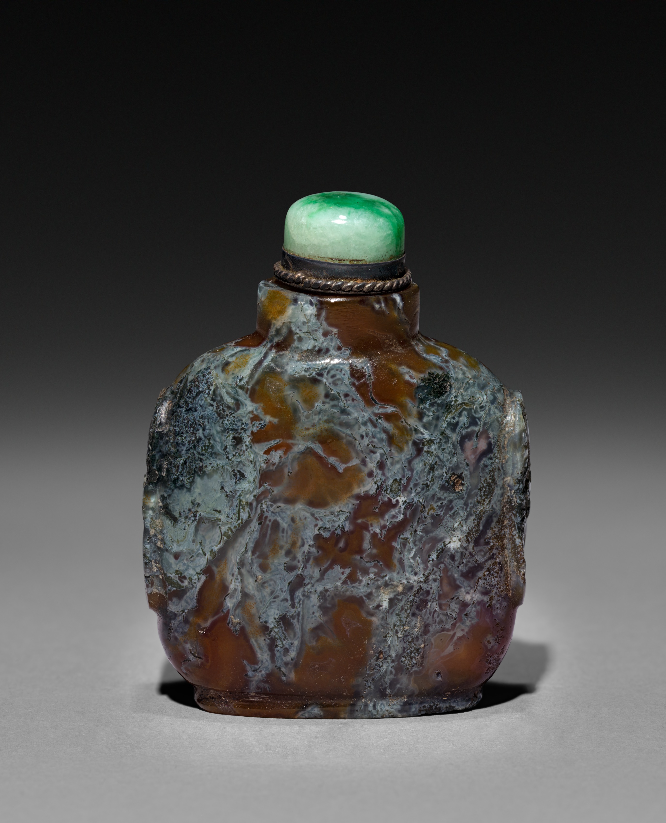 The Snuff Bottle by an unknown artist is a rounded, ornamental vessel. The body of the bottle is predominantly brown, with swirling patterns of gray and white throughout. A metal collar encircles the neck of the bottle. The stopper is a smooth, rounded green stone. The background transitions from dark to light gray.