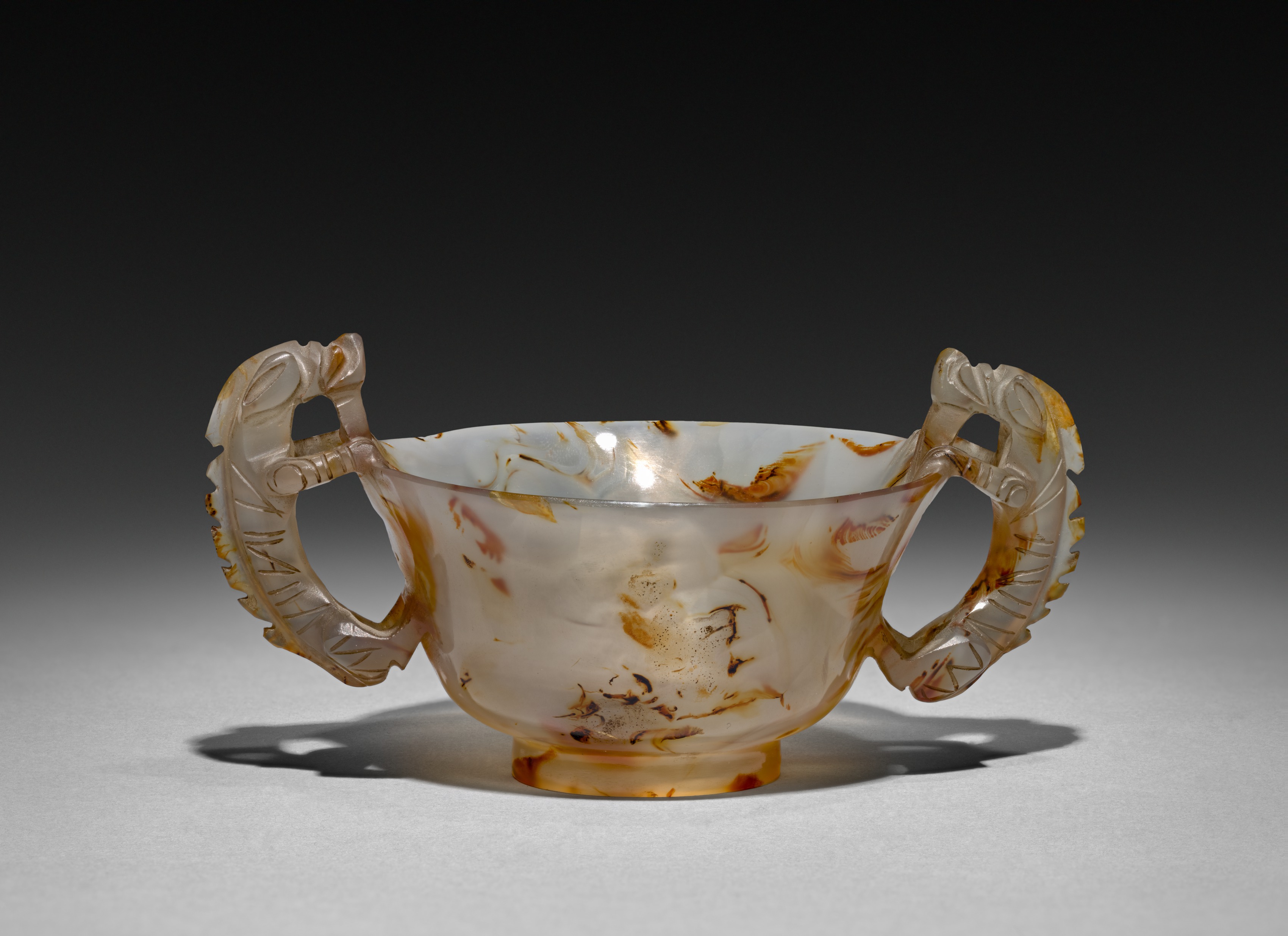 The Libation Cup by artist Liu Kaiqu is a bowl made of semi-transparent white and brown stone. The bowl is shallow with a wide mouth and short base. Two handles are on either side of the bowl, carved into the shape of mythical creatures with large eyes and curled tails. The handles are attached to the bowl and extend upwards, curving outwards and then back inwards towards the bowl. The body of the bowl features streaks of brown throughout. The background of the image is dark at the top and light at the bottom, with a shadow cast by the bowl.