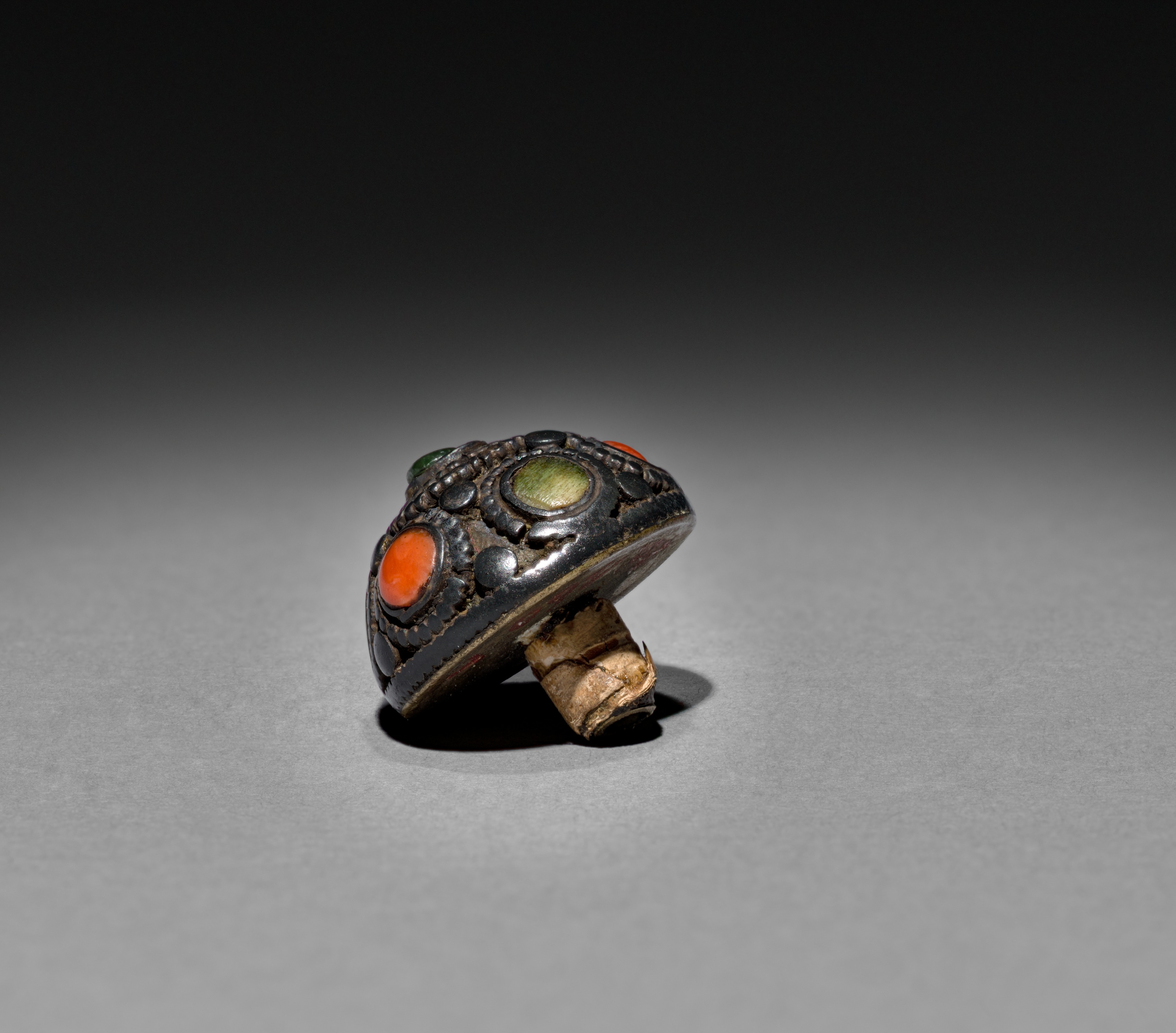 Snuff Bottle stopper. Small metal object with a rounded top and flat bottom. The top has 3 circular inlaid stones. One green stone in the center, and 2 orange stones on the sides. There are etched designs around the stones. A cylindrical beige object protrudes from the center bottom. The background transitions from black at the top to gray at the bottom.