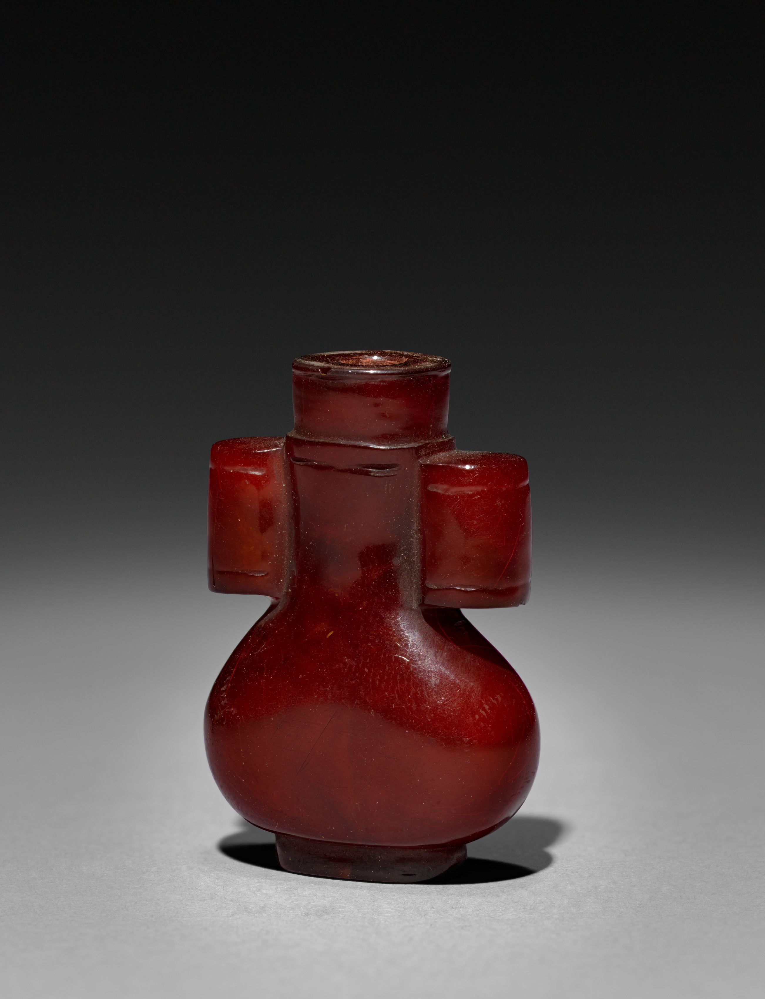 The Snuff Bottle by an unknown artist is a red, glass or crystal object with a bulbous body and a cylindrical neck. The body is bulbous with a narrow base and a wider middle section. The neck is cylindrical and short with a small opening at the top. Two small, cylindrical protrusions are on either side of the neck, near the top. The object has a glossy finish and appears to be made of a translucent material, possibly glass or crystal. The color is a deep, rich red. The object is sitting on a flat surface, casting a shadow behind it. The background is dark at the top and light gray at the bottom.