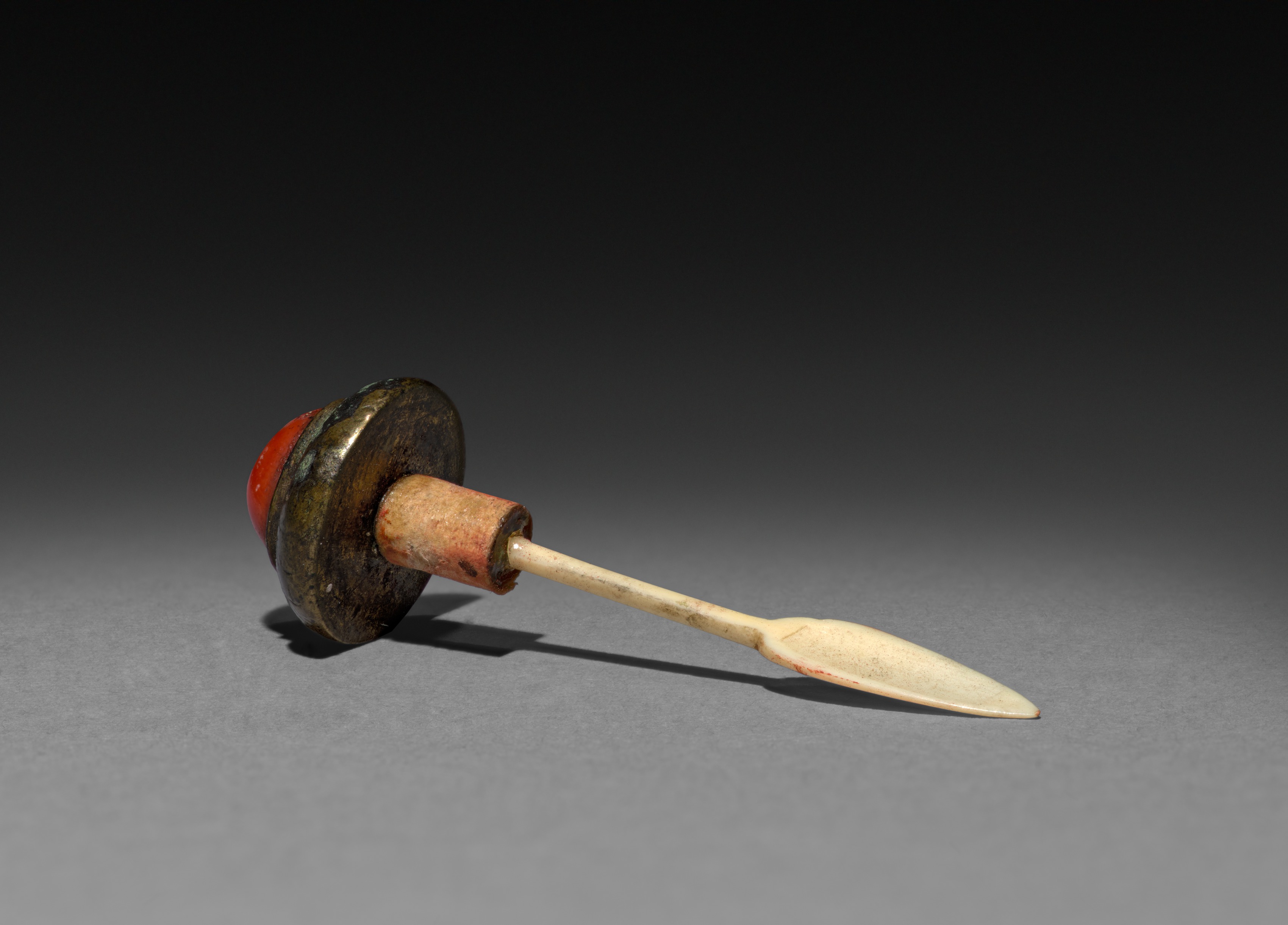 Snuff Bottle stopper, artist not identified. The object is a stopper for a snuff bottle. It has a flat, circular base made of dark-colored material, possibly stone or metal, with a red band around the middle. The base is approximately one-third the length of the entire object. A short, cylindrical piece of light brown material, possibly wood or bone, extends from the base. The cylindrical piece is about one-third the length of the entire object. A long, thin, tapered piece of light-colored material, possibly ivory or bone, extends from the cylindrical piece. The tapered piece is approximately two-thirds the length of the entire object, and it comes to a sharp point at the end. The object is lying on a gray surface with a shadow underneath it, and the background is dark gray to black.