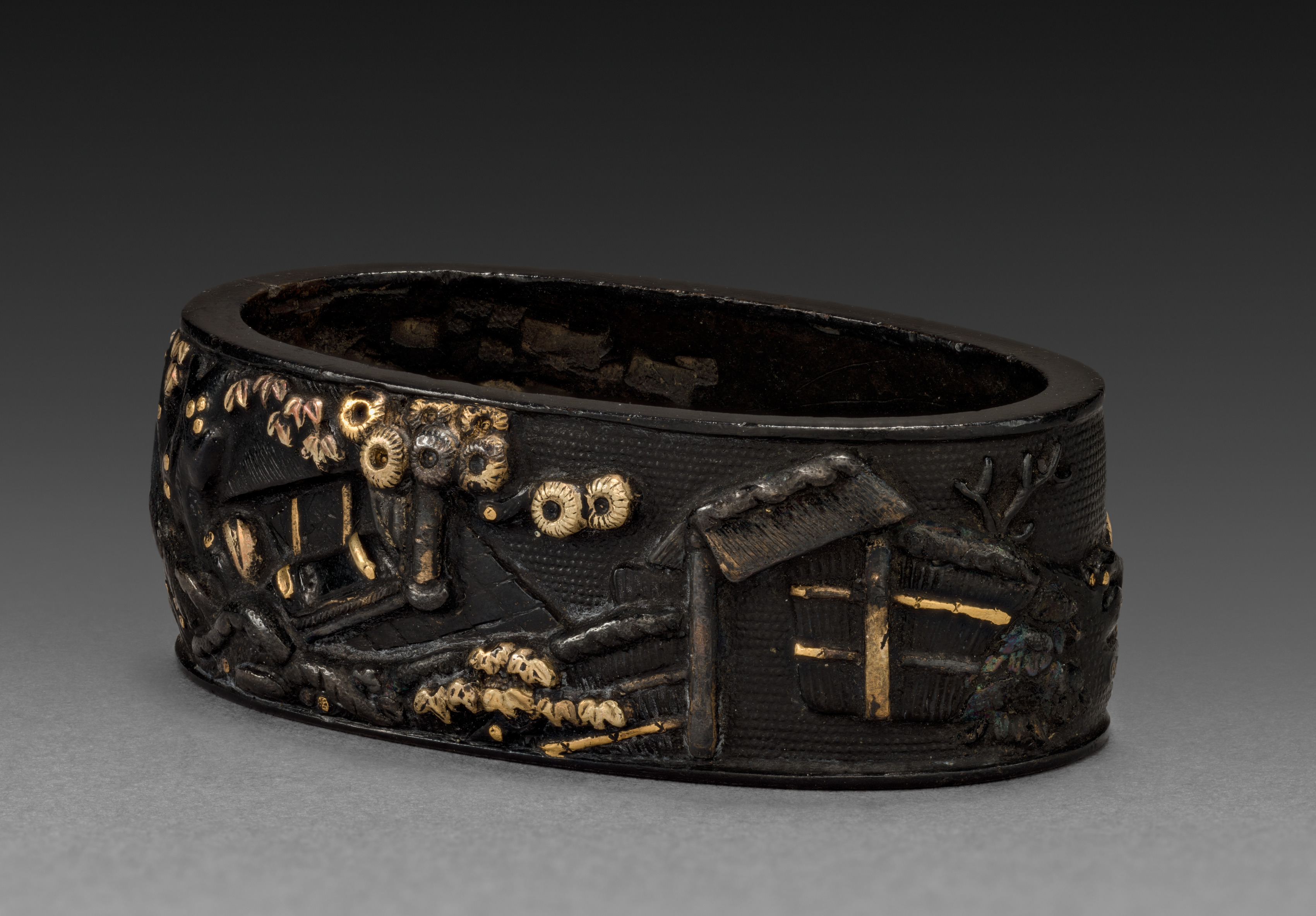 Black metal collar with a wide, flat band. The exterior surface features a design in gold, depicting a building with a sloping roof on the right side and a tree on the left. The tree has a thick trunk and branches with flowers or leaves. The background of the image is dark gray, transitioning to light gray at the bottom. The collar is titled "Sword-Hilt Collar (Fuchi)" and is attributed to an unknown artist.