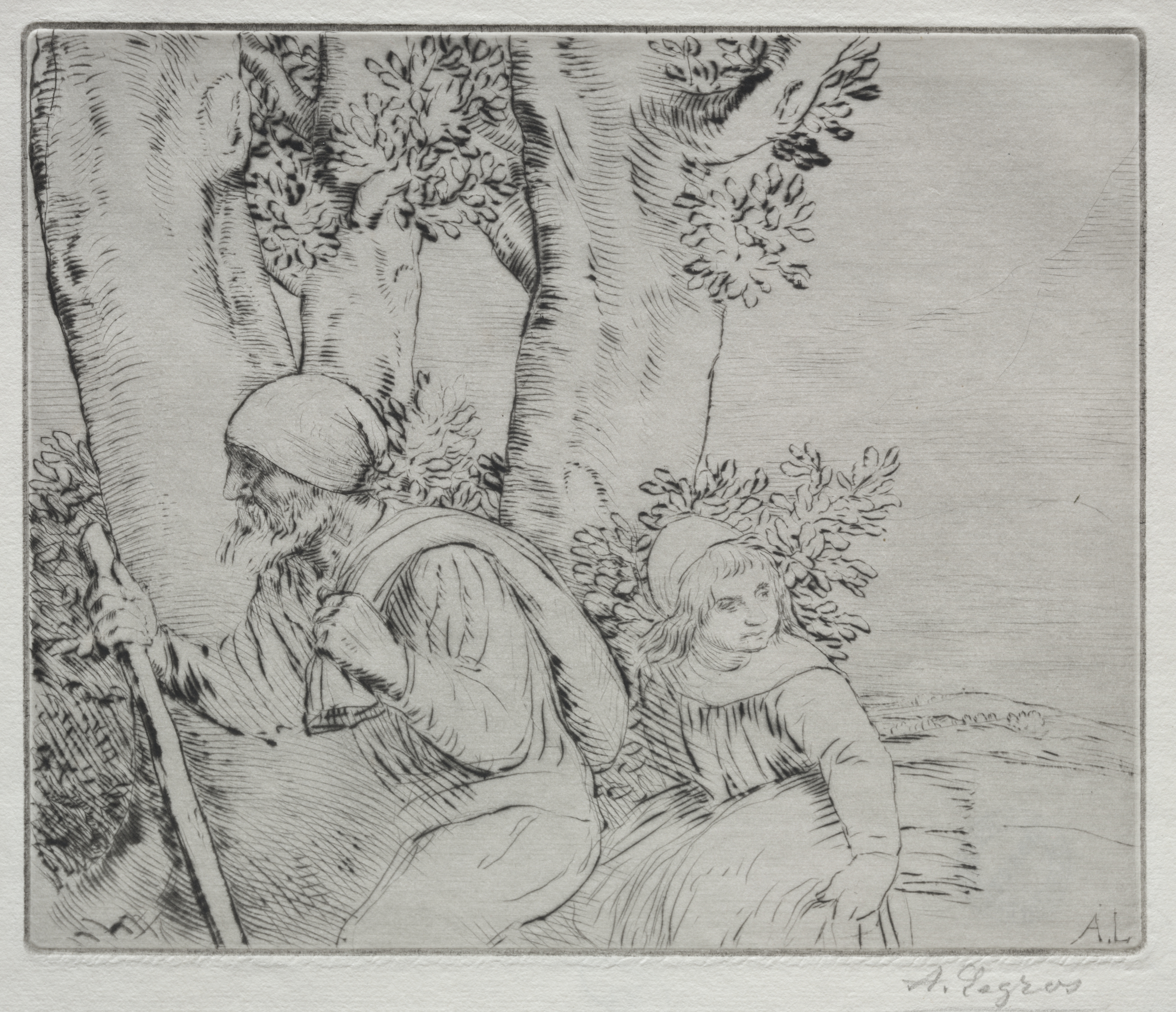 Black and white drawing of a man and a woman sitting under a tree. The man is on the left, wearing a hat, with his back to the viewer. He has a long-sleeved shirt and a long object, possibly a walking stick, in his right hand. The woman is on the right, also wearing a hat, with a long-sleeved dress. She is looking to her right. There are trees and foliage behind them. The drawing is signed in the bottom-right corner.