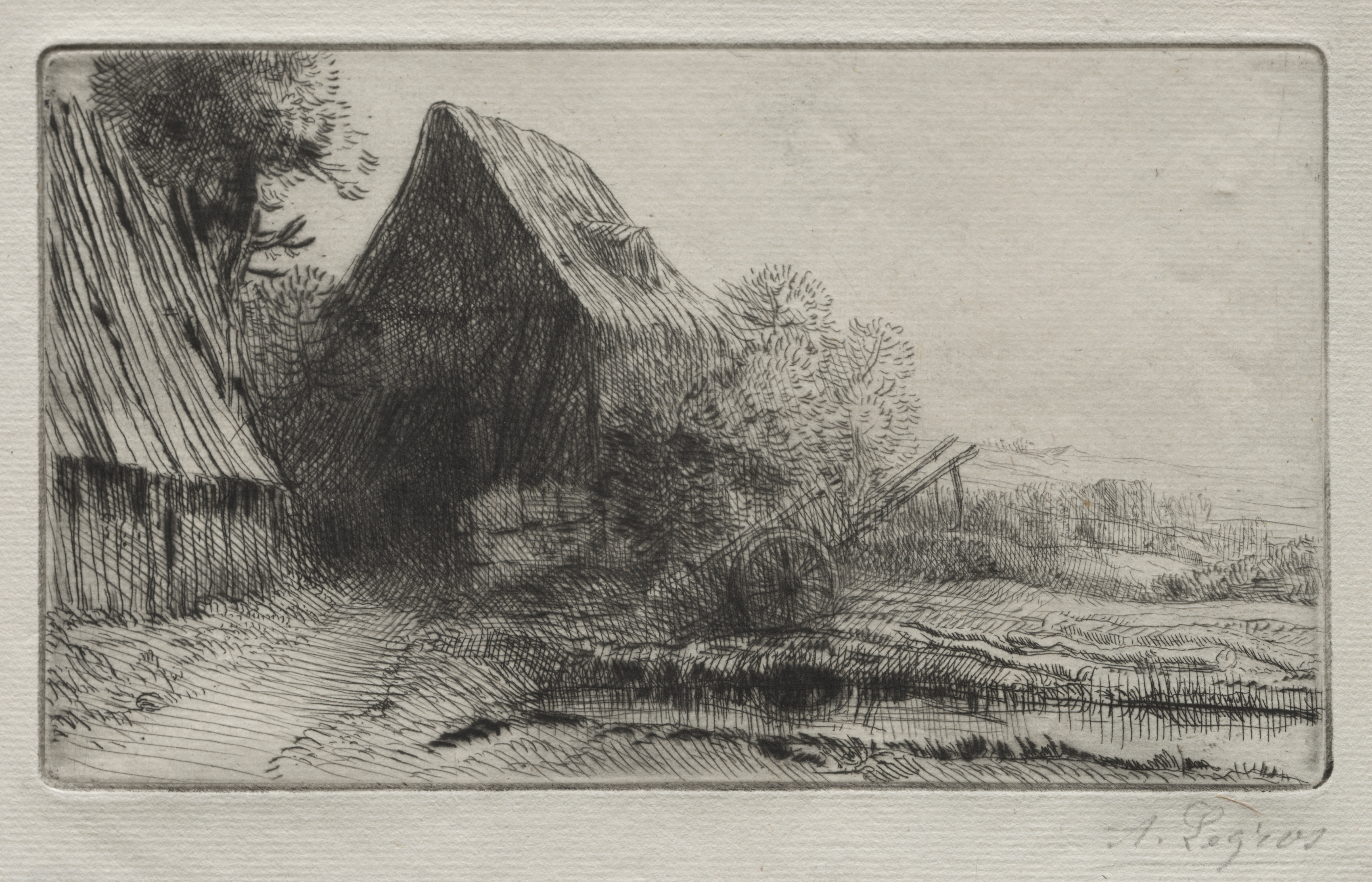 Black and white etching of a house or barn with a sloping roof, next to another building. The house has a water wheel on the side. There are trees and vegetation around the buildings. A stream or small body of water is in the foreground. The sky appears hazy. The image is signed in the bottom right corner. The title is "Le Maison du charron" and the artist is Alphonse Legros.