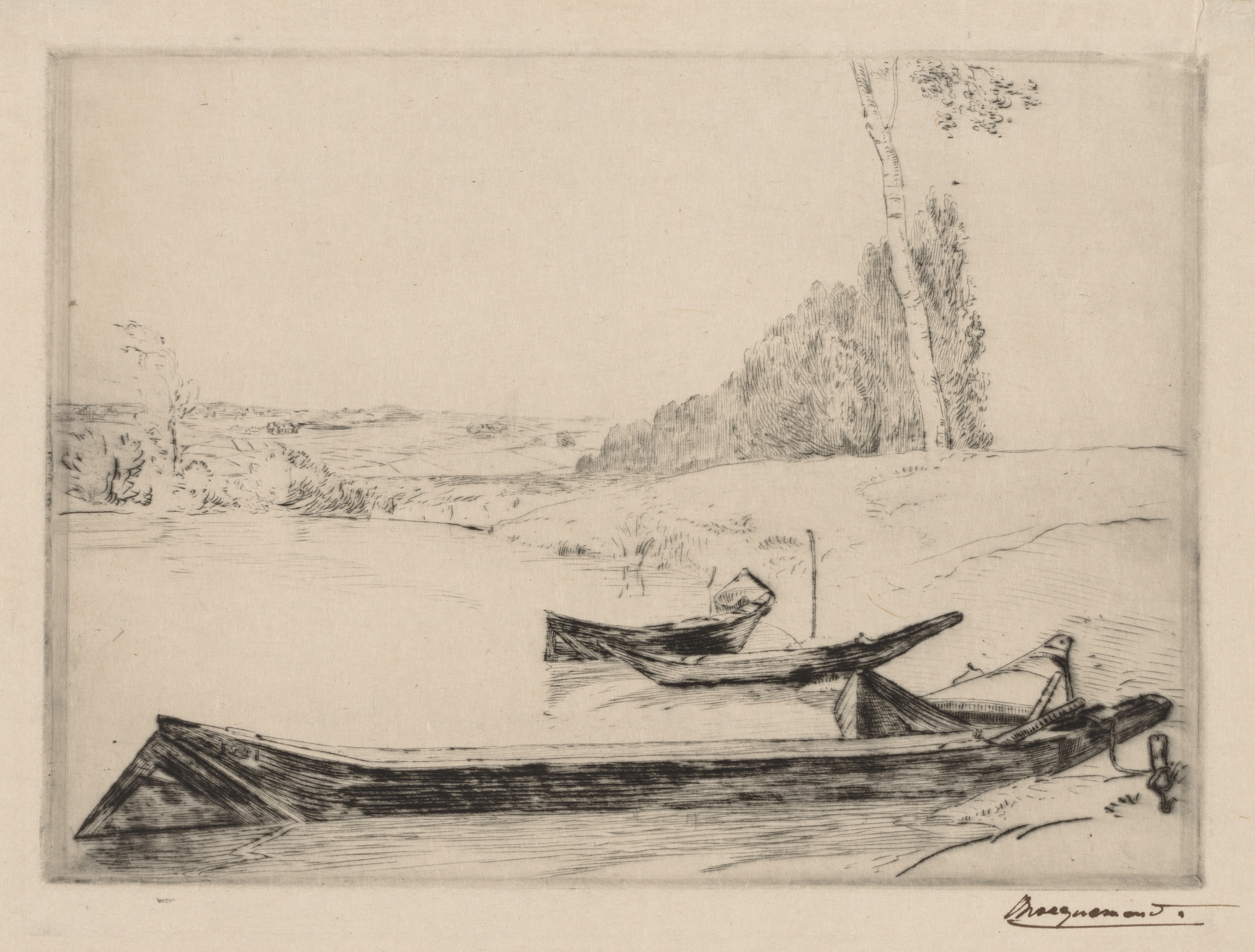 The image depicts a landscape drawing of a riverbank scene. The riverbank has grass, trees and bushes on the right side. Two small boats are on the river, which runs horizontally across the image. The boats are darkly shaded with lines suggesting wood grain. The boat in the foreground is positioned with its bow to the left. The boat in the background is further up the river. The sky above is blank and light-colored. The artist's signature appears in the bottom-right corner. The image is rendered in shades of gray on a beige background.