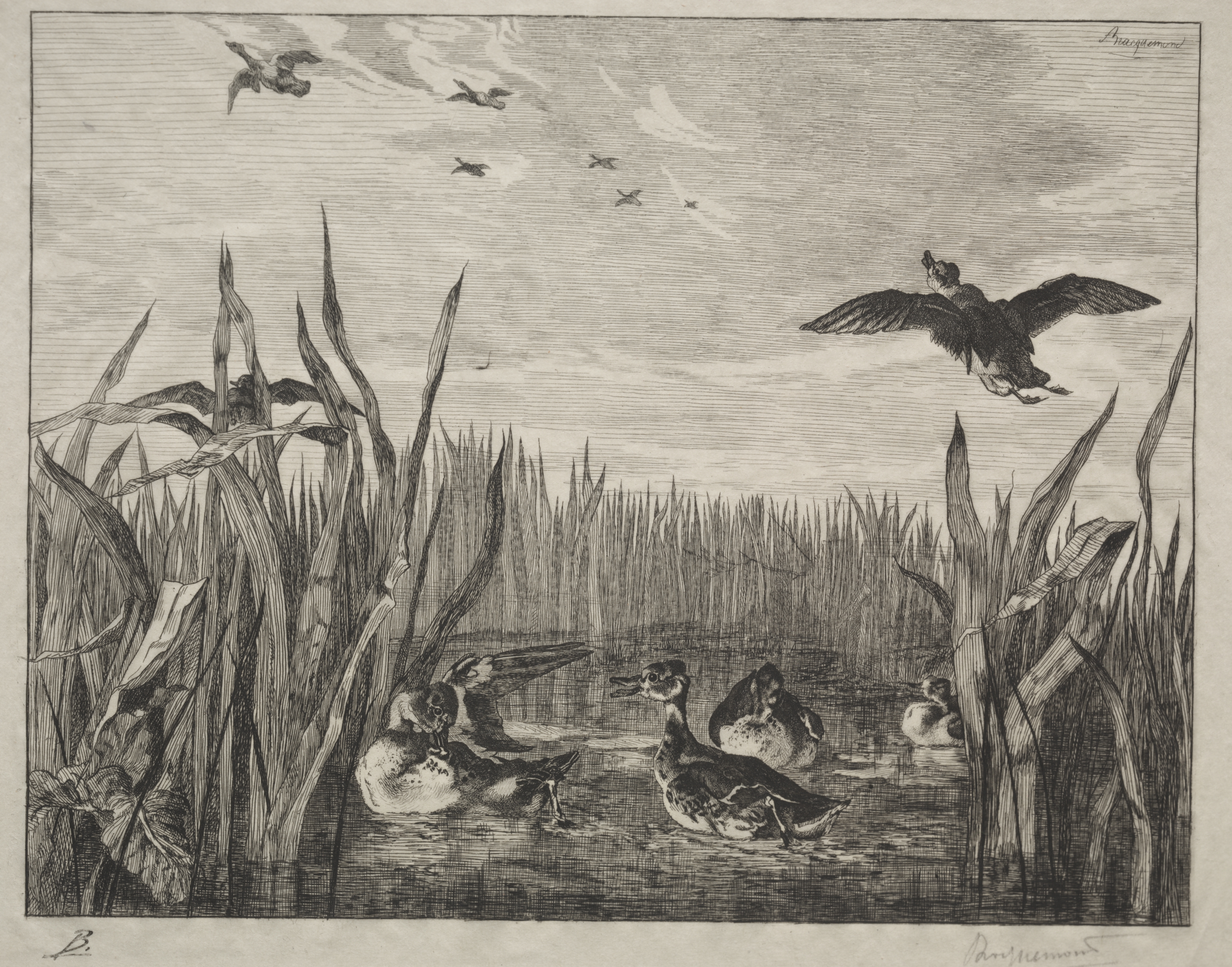 Teal by Félix Bracquemond: A black and white illustration of a group of ducks in a pond surrounded by tall grasses. Several ducks are sitting in the water, while one duck flies above them. In the background, several more ducks fly in the sky. The illustration is done in a detailed and realistic style, with visible texture and shading. The artist's signature is visible in the top-right and bottom-right corners.
