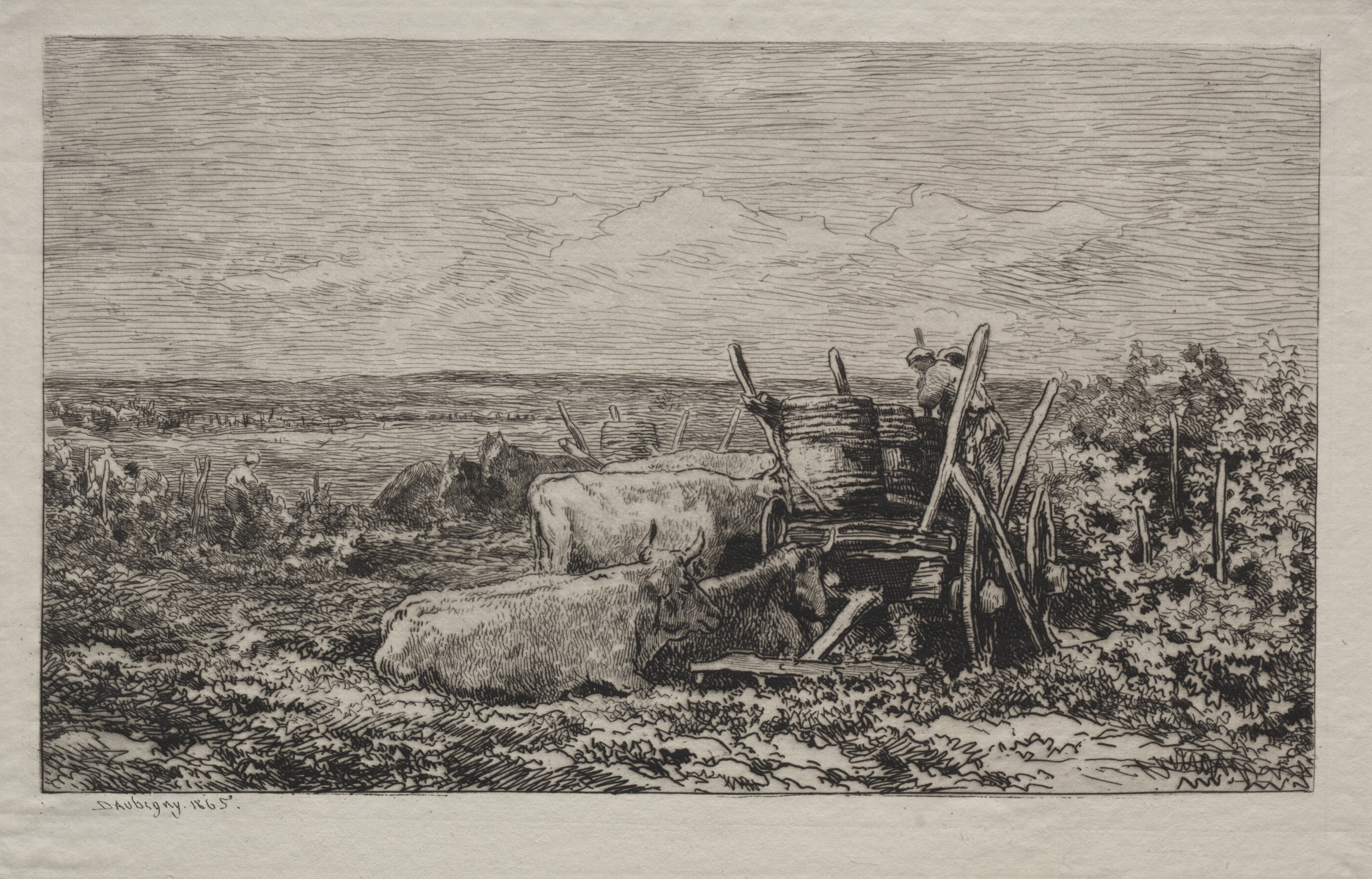 The image depicts a black-and-white drawing of a rural scene. A man wearing a hat sits on a wooden cart with large barrels, accompanied by two oxen. The cart and oxen are positioned in the foreground, with the man sitting on the right side. The ox on the left lies down, while the one on the right stands. In the background, several people are visible in a field to the left. A fence runs along the right side of the image. The sky above features clouds, and the overall atmosphere suggests a daytime setting. The artist's signature "Daubigny. 1865" is visible at the bottom left corner.