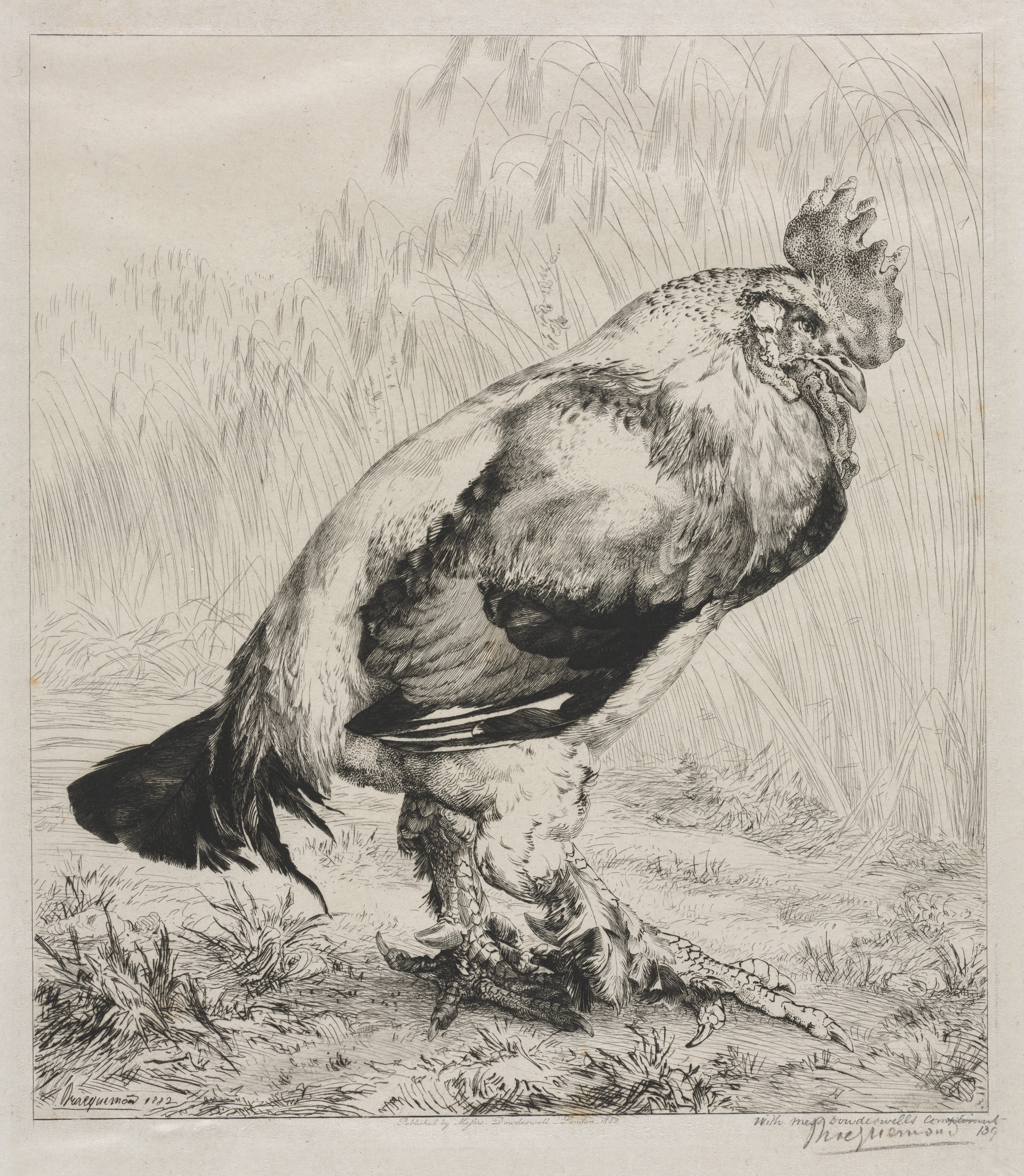 The image depicts a rooster. The rooster has a large body and a distinctive comb on top of its head. Its beak is open. The rooster's feathers are shaded in various tones. The background features tall grasses. The artwork is titled "The Old Cock" by Félix Bracquemond.