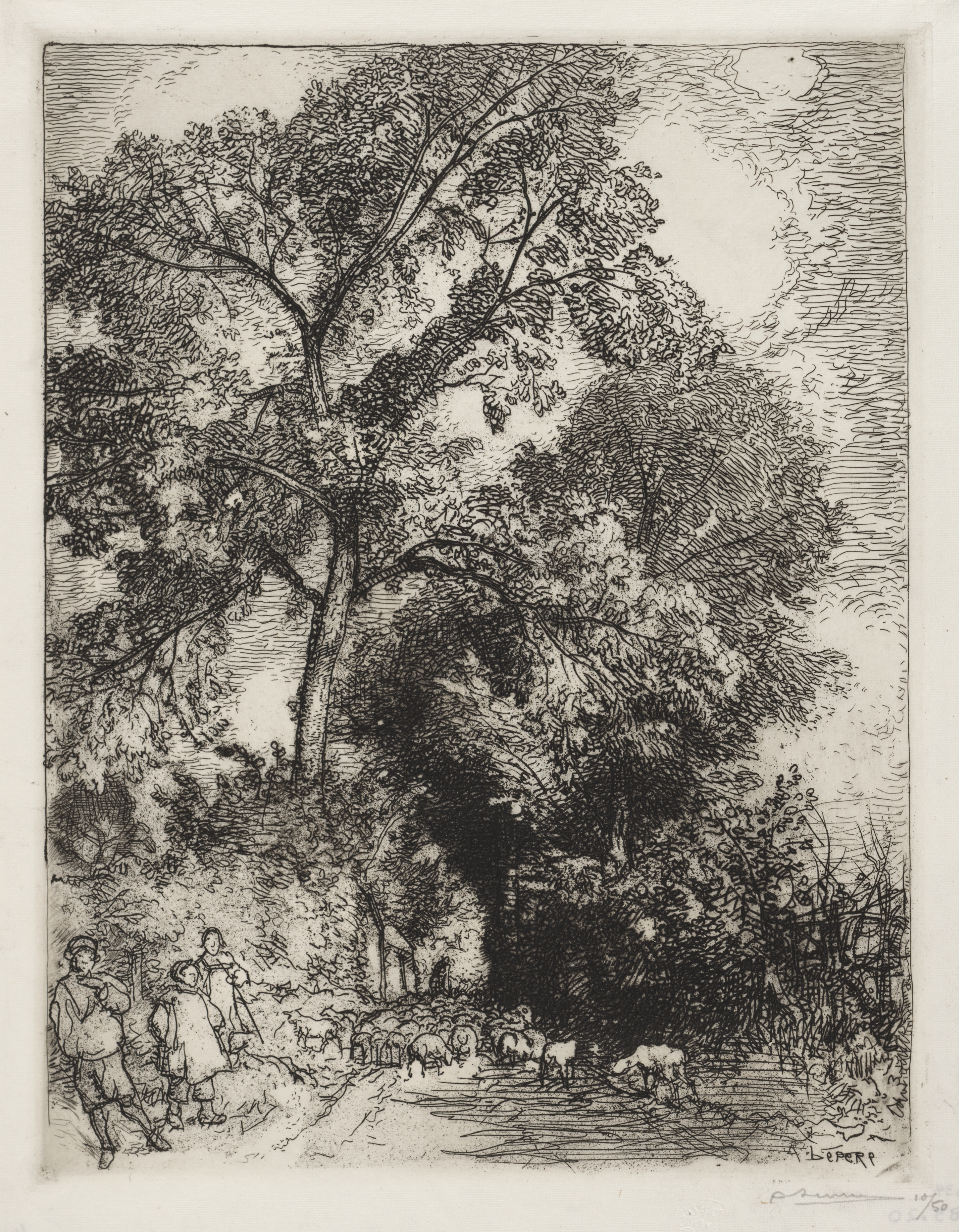 Black and white landscape drawing of a man and a woman on a path surrounded by trees. The man on the left wears a hat, long-sleeved shirt and shorts. The woman on the right wears a dress and a wide brimmed hat. They are herding a group of sheep, goats and a dog. The sky contains large clouds. A tree with sprawling branches occupies much of the top half of the image. The drawing is signed in the bottom right corner.