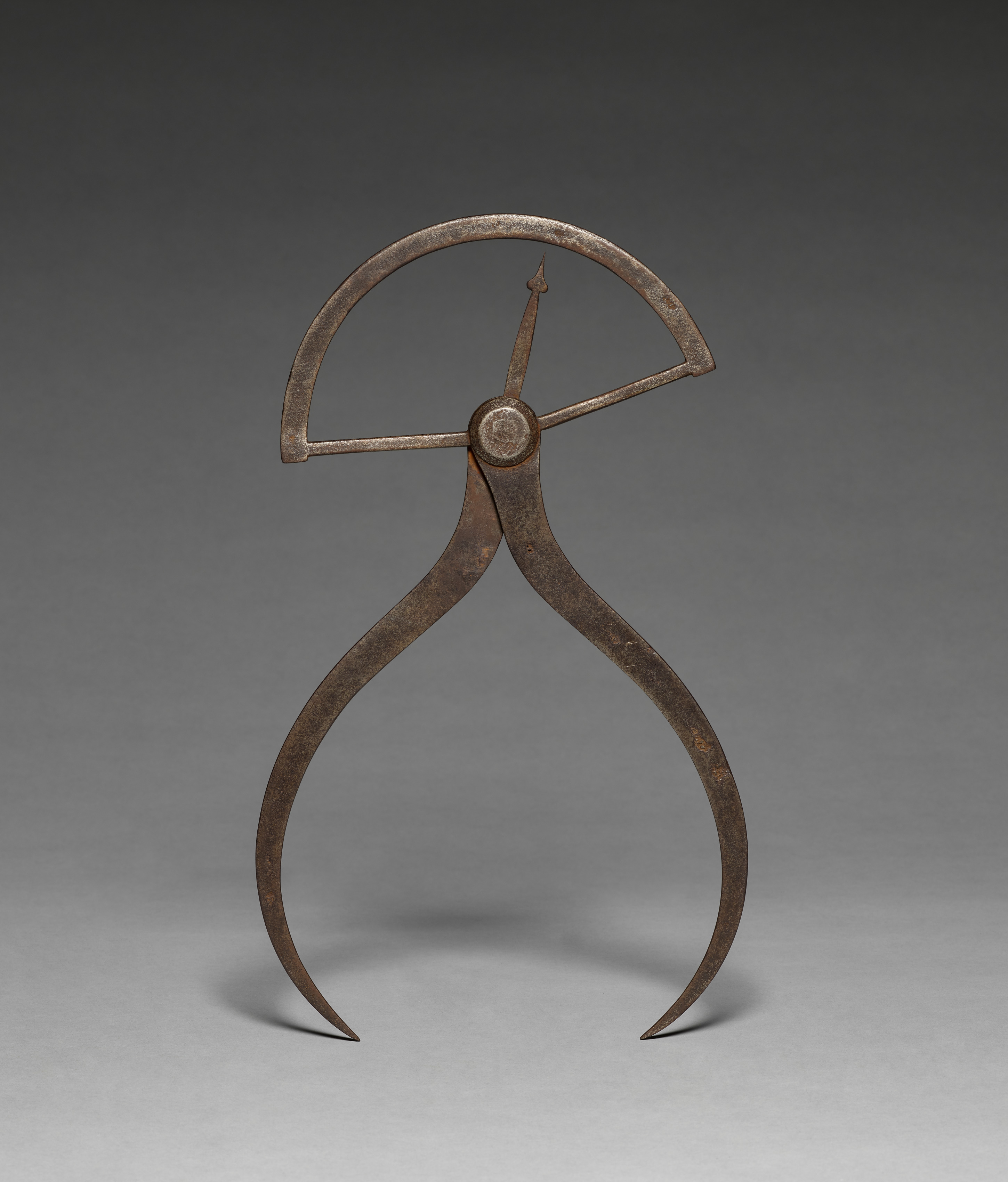 Metal tool with two long curved legs ending in sharp points, connected at the top by a semicircular piece with a rotating pointer. The semicircular piece is positioned at the top center, with the pointer extending from the center to the edge. The legs are symmetrical and taper to a point at the bottom. The entire tool appears to be made of rusted metal with a dark brown color. The background is a gradient gray. The title of the image is Calipers and the artist is unknown.