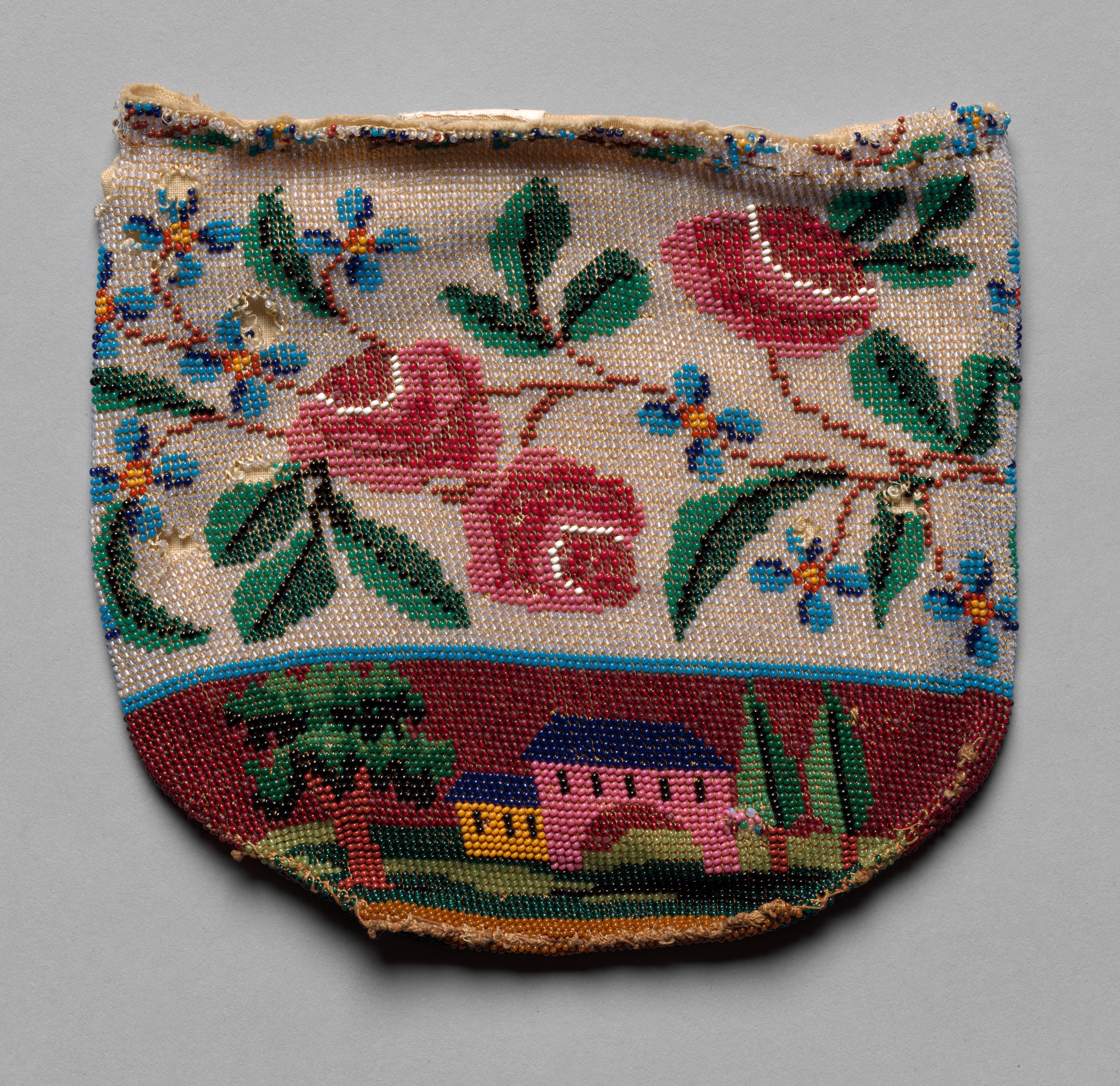 Beaded bag with a floral design and a house. The bag is made of small, tightly packed beads in various colors, including white, blue, green, red, orange, and pink. The top half features a floral pattern with pink flowers, green leaves, and blue and orange accents. The bottom half depicts a pink house with a blue roof and a yellow door, surrounded by trees and greenery. The bag has a curved bottom and straight top, with a rough, frayed edge. The background of the image is gray.